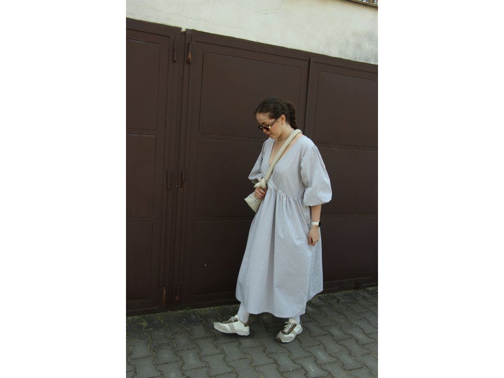Šaty s balonovými rukávy ušité z 100% bavlněného mušelínu, midi délka s kapsami a překřížený top ve kterém pohodlně nakojíte.
