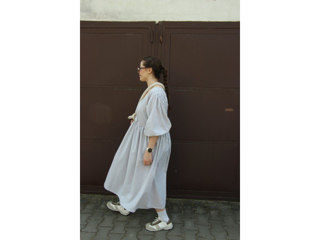 Šaty s balonovými rukávy ušité z 100% bavlněného kanafasu.
