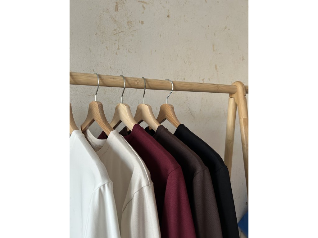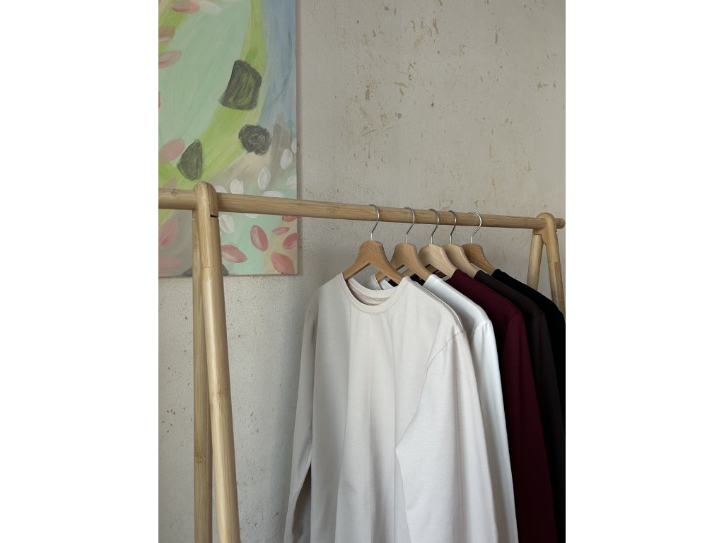 Minimalistické tričko z bavlněného úpletu na každý den. Dlouhý rukáv, který krásně funguje i ohrnutý, mírně spadlá linie ramen, oversized střih.