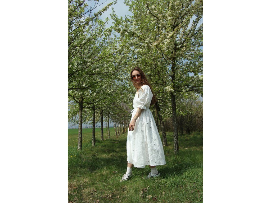 Celozavinovací střih, který si utáhnete dle vlastního těla. Jsou ušité z bavlněné madeiry s květinami. Lehoučký a vzdušný materiál ve kterém se budete i v parném počasí cítit jako byste na sobě nic neměla. Jelikož je materiál opravdu lehoučký, latka je mírně průsvitná, zároveň šaty nejsou podšité a v látce jsou dírky, doporučuji podvlékat nude cyklo šortky a nějaké tílko či crop top.