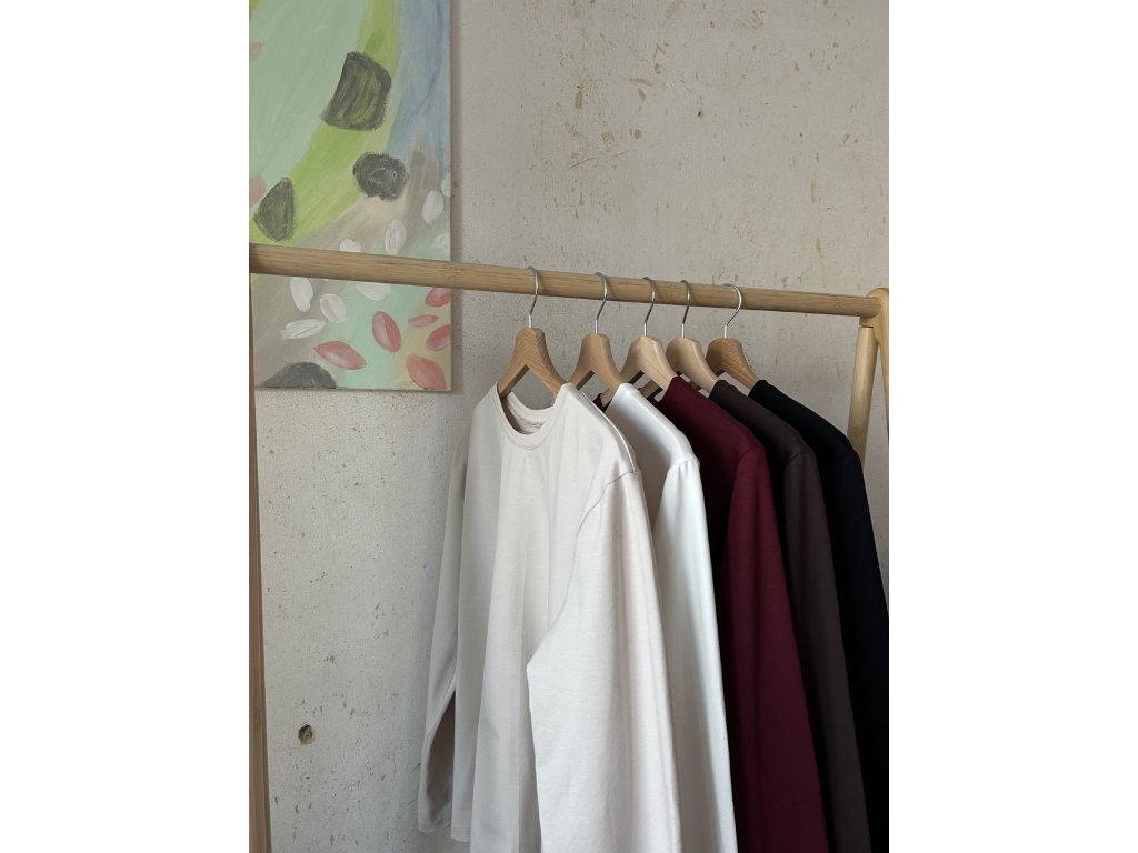 Minimalistické tričko z bavlněného úpletu na každý den. Dlouhý rukáv, který krásně funguje i ohrnutý, mírně spadlá linie ramen, oversized střih.