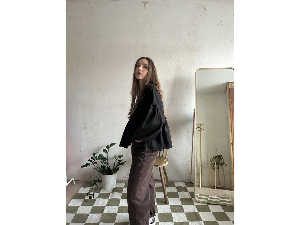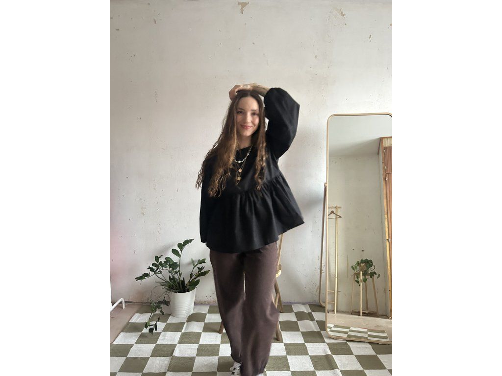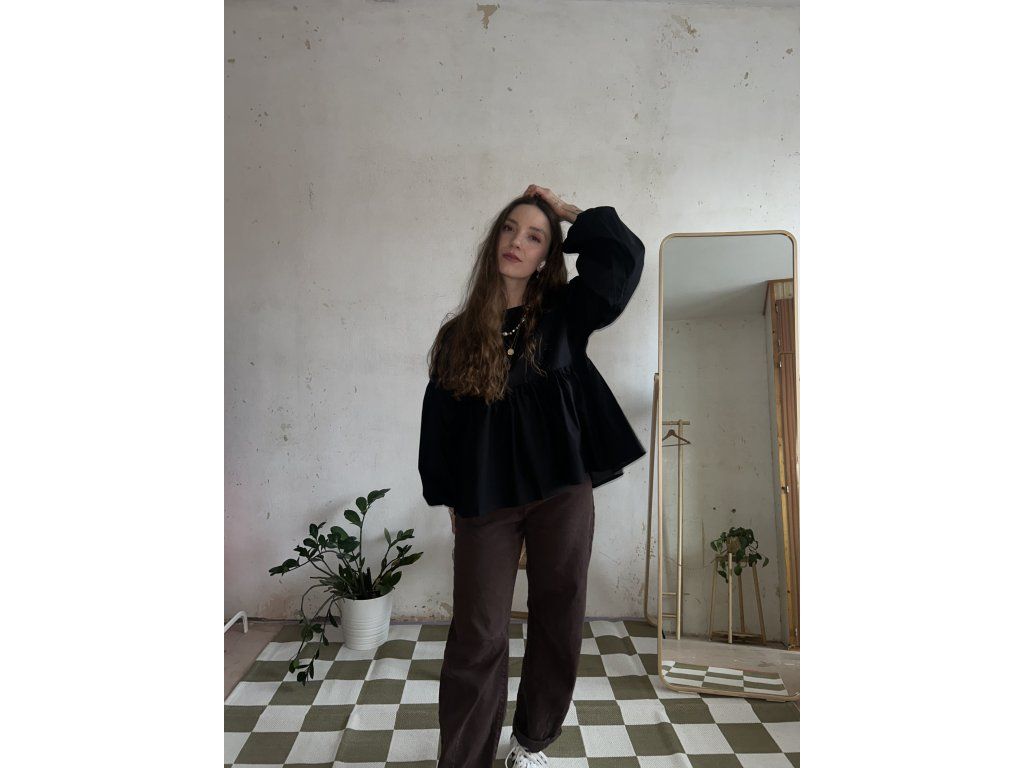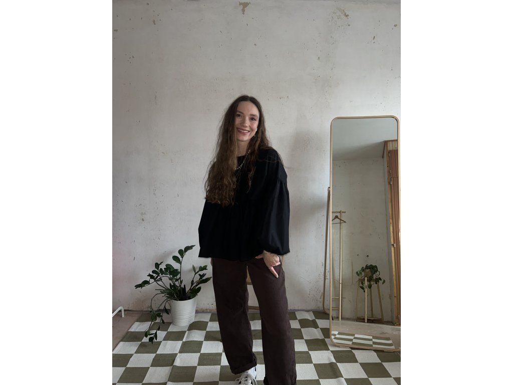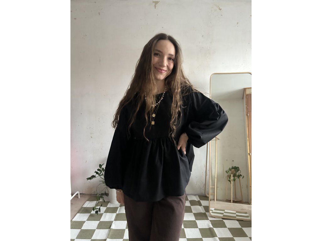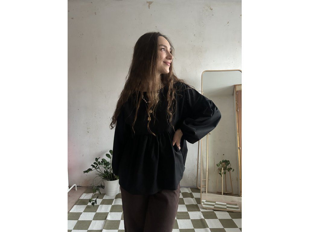 Halenka ušitá z bavlněného popelínu s volánkem a dlouhým balonovým rukávem. Volný střih pro maximální pohodlí.