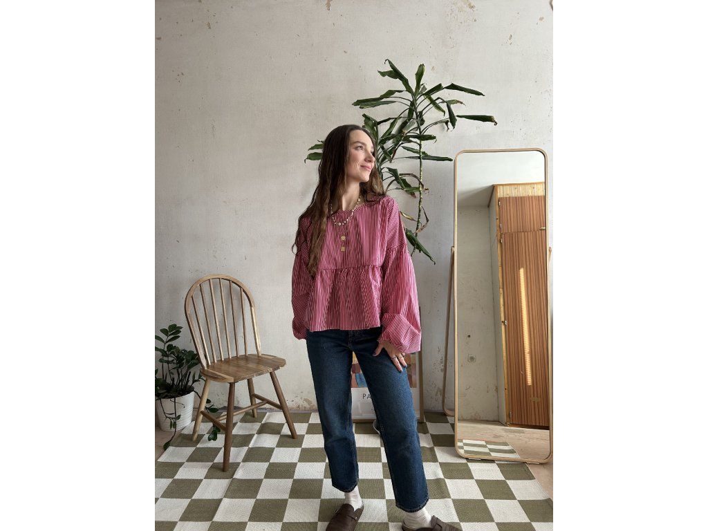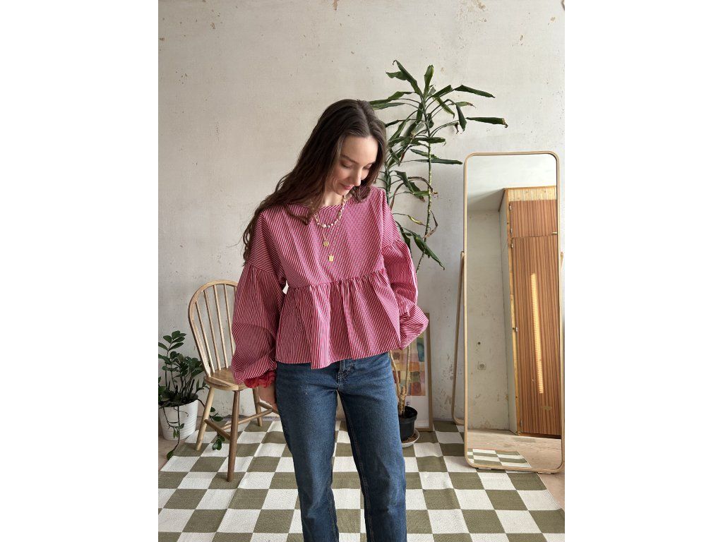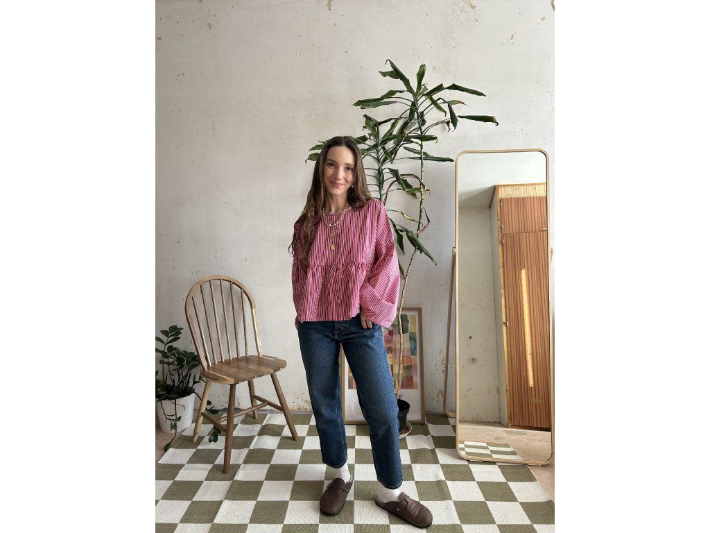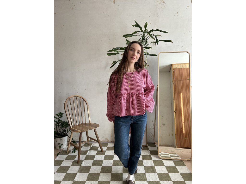 Halenka ušitá z bavlněného popelínu s volánkem a dlouhým balonovým rukávem. Volný střih pro maximální pohodlí.