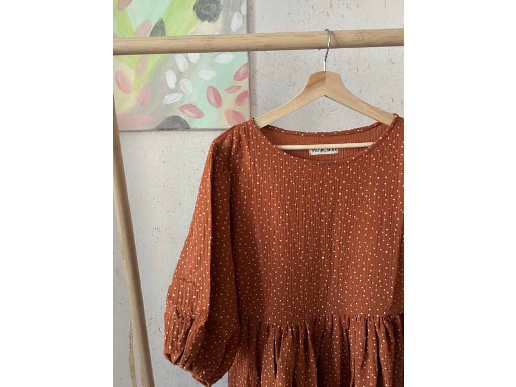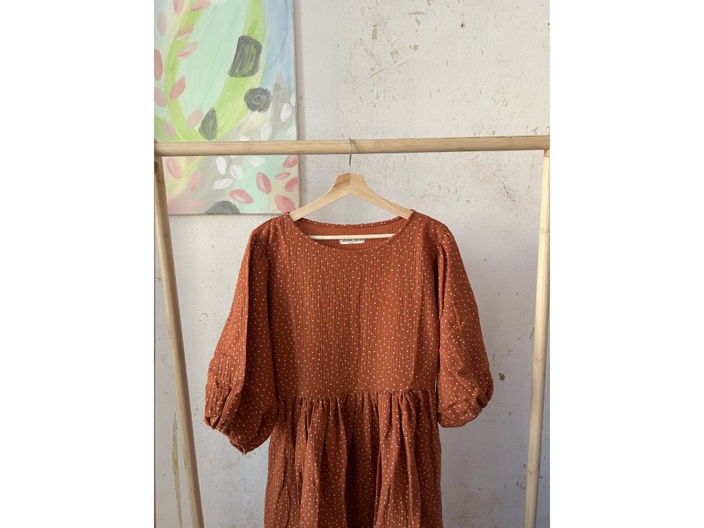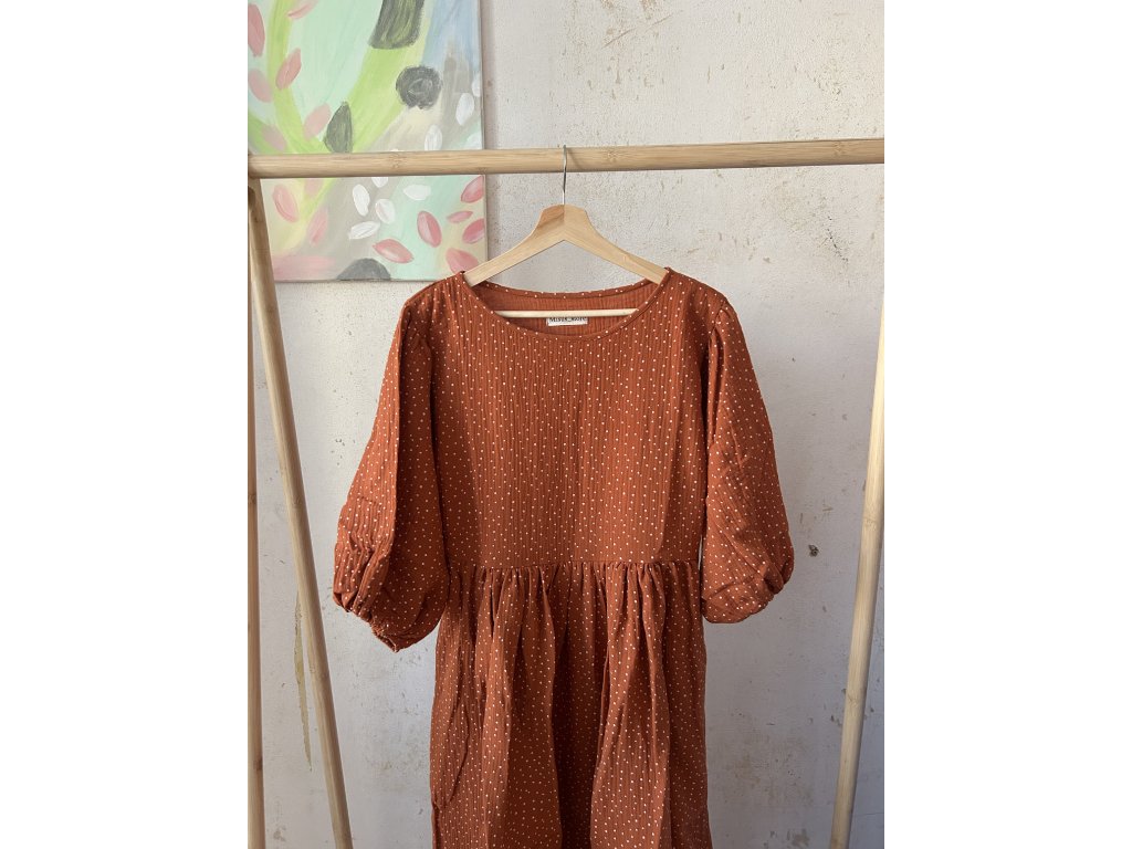 Šaty s balonovými rukávy ušité z bavlněného mušelínu. midi/maxi délka, sukně s kapsami a klasický top.