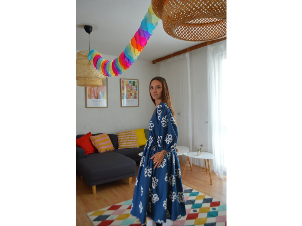 Šaty s kratšími balonovými rukávy a midi/maxi délka, sukně s kapsami a klasický top. Šaty jsou ozvláštněné provázky v pase, které si můžete zavázat dle libosti. Zavázání krásně zvýrazní pas.