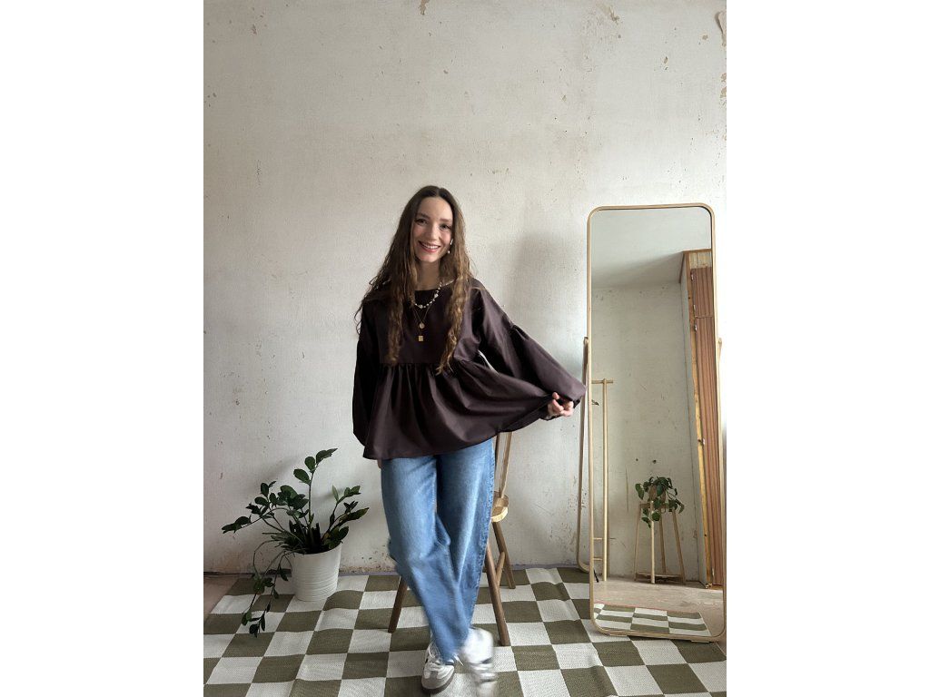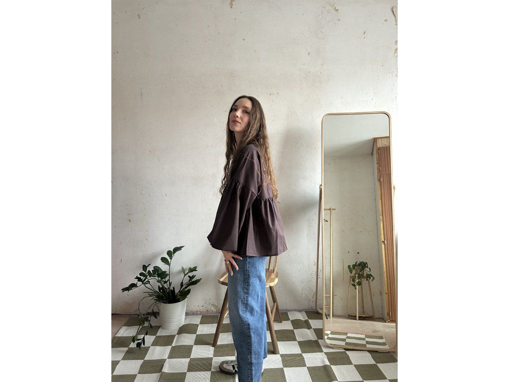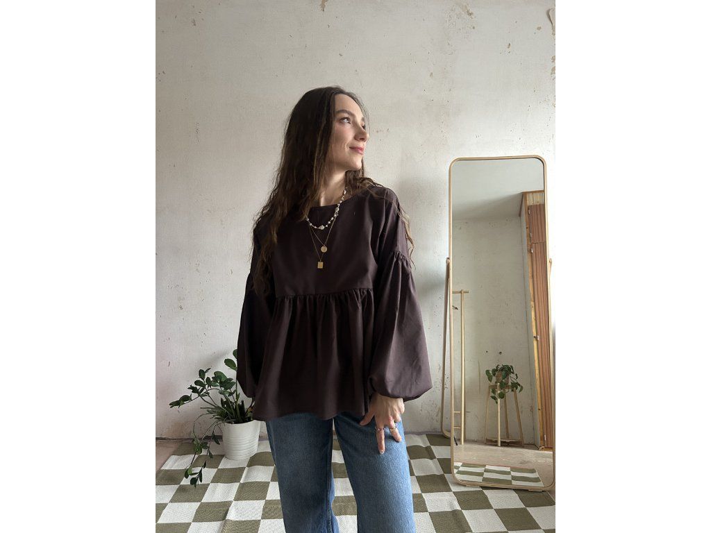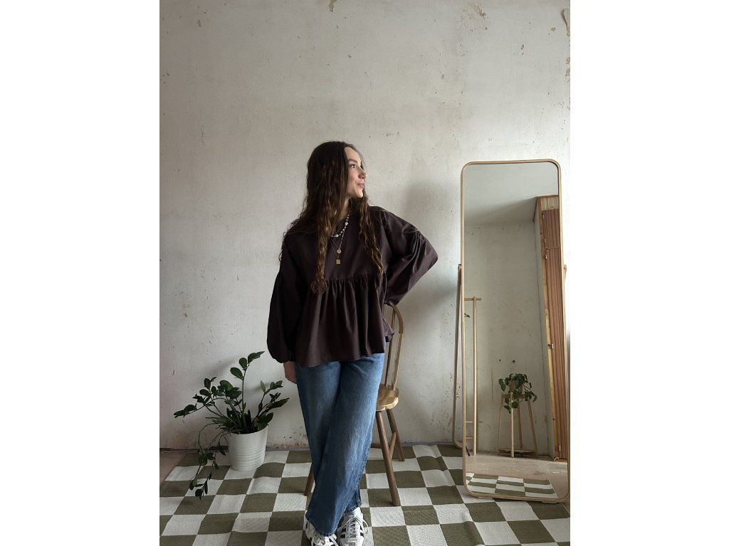 Halenka ušitá z bavlněného popelínu s volánkem a dlouhým balonovým rukávem. Volný střih pro maximální pohodlí.