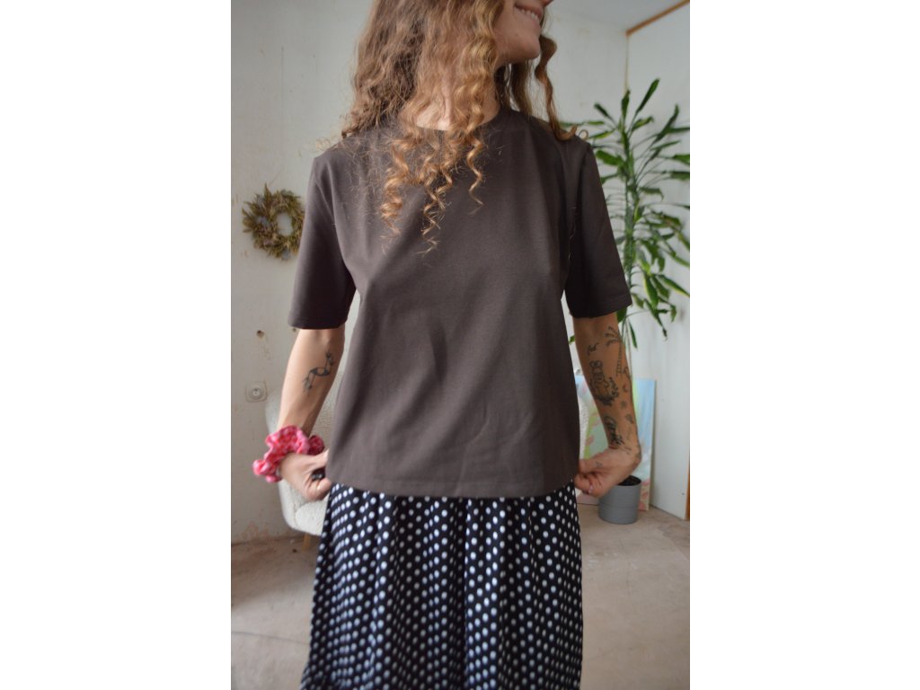 Minimalistické tričko z bavlněného úpletu na každý den. Prodloužený krátký rukáv, mírně spadlá linie ramen, zkrácený střih, aby se dalo tričko příjemně zastrčit do kalhot nebo sukně.