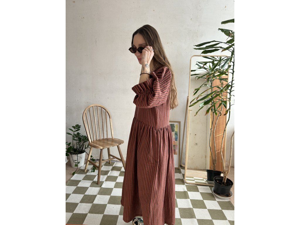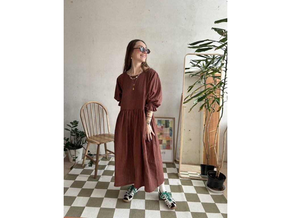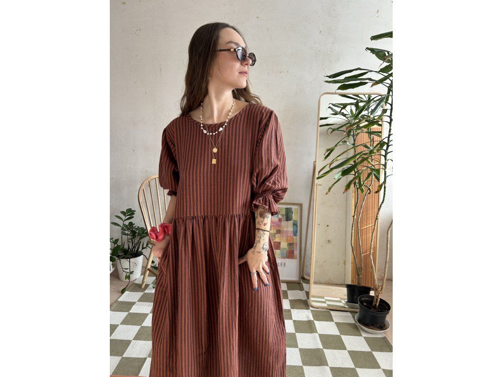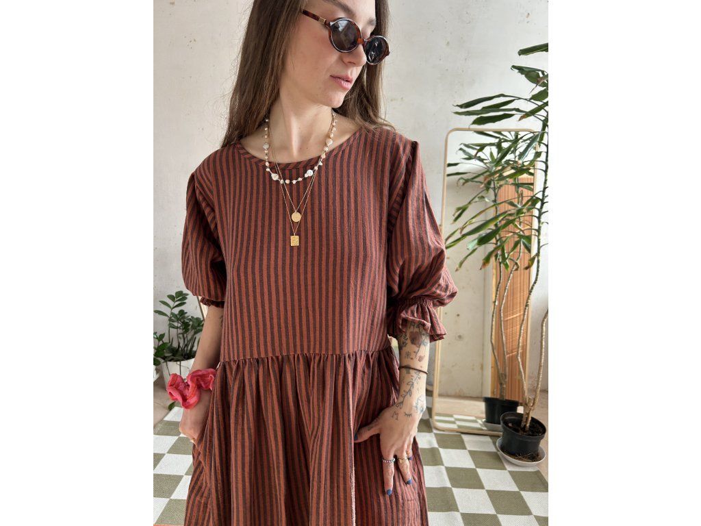 Hnědé proužkované šaty z mušelínu