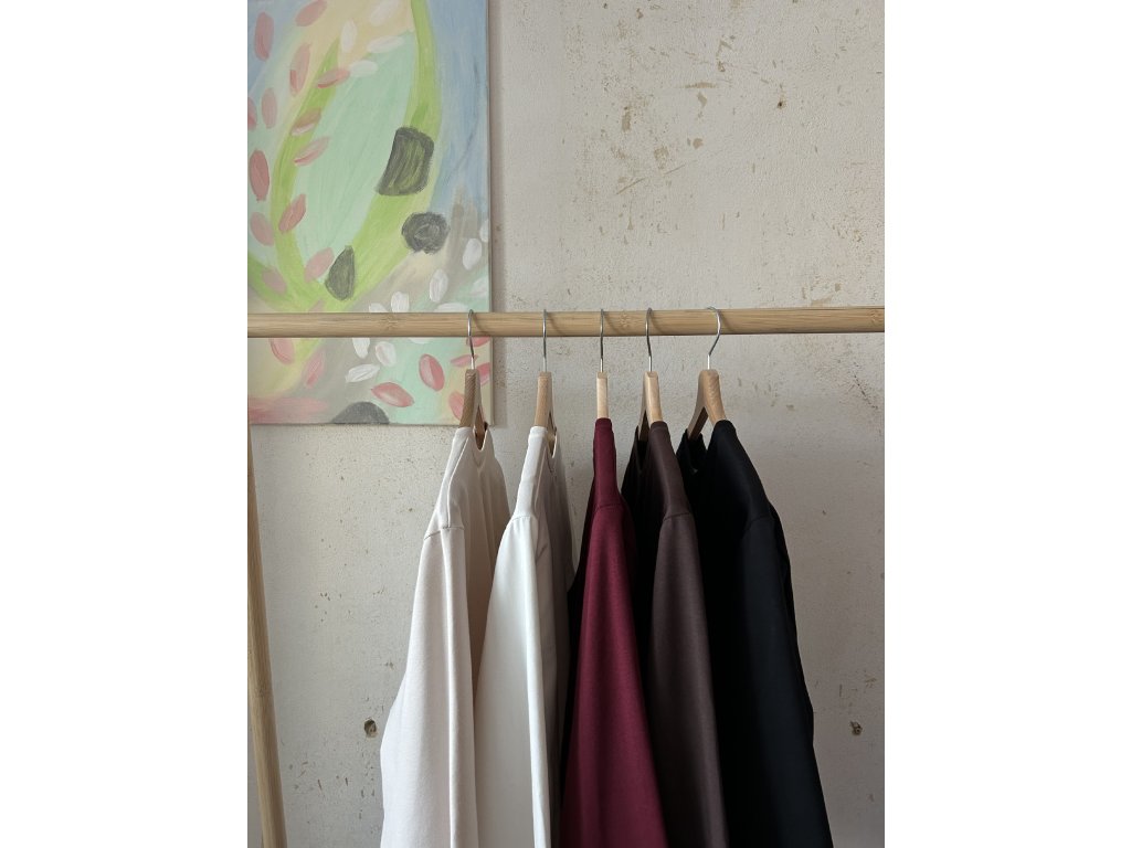 Minimalistické tričko z bavlněného úpletu na každý den. Dlouhý rukáv, který krásně funguje i ohrnutý, mírně spadlá linie ramen, oversized střih.