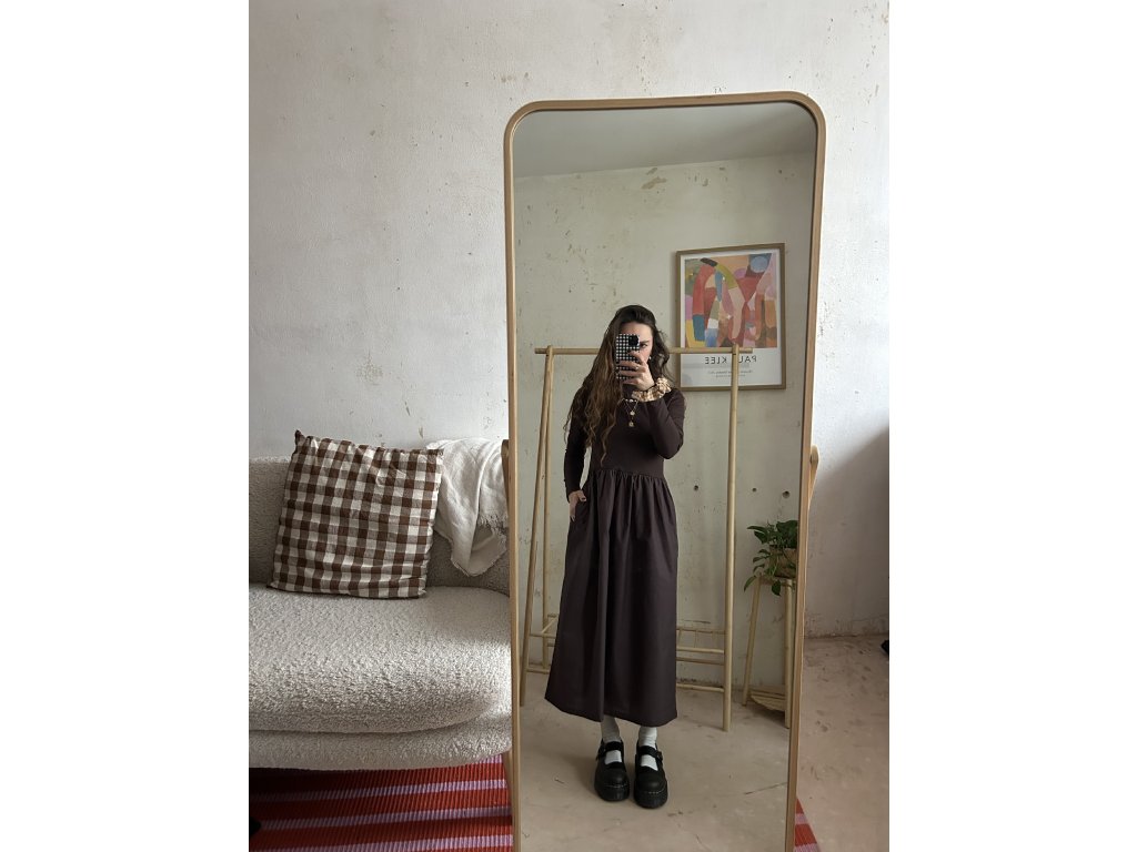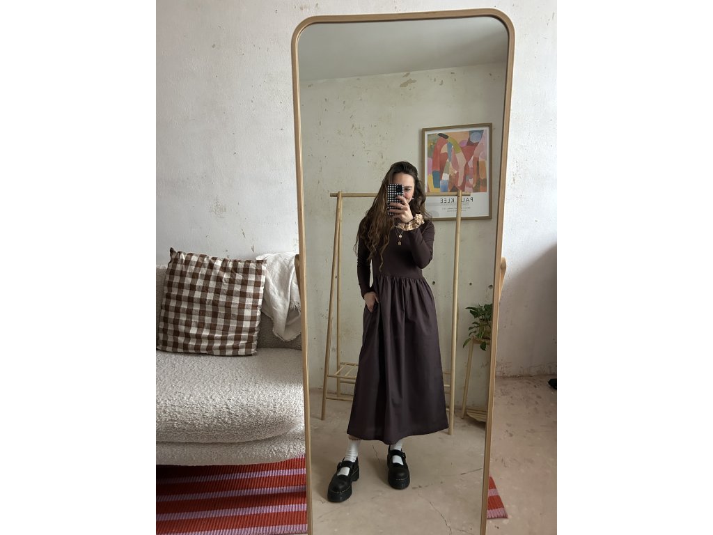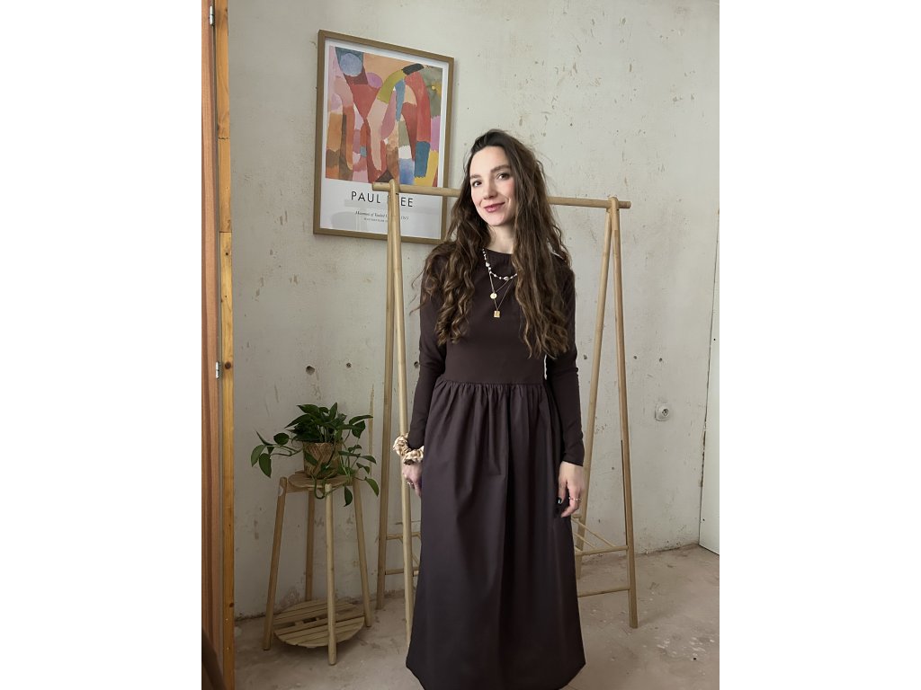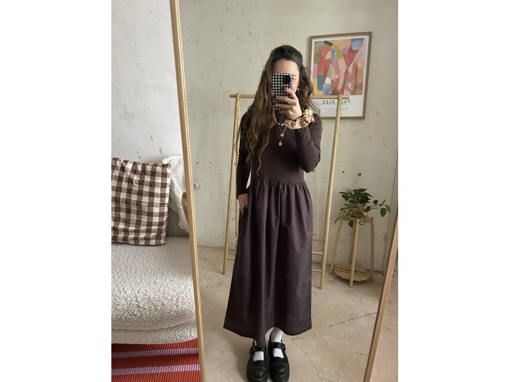 Šaty ušité z bavlněného úpletu (97%bavlna, 3%elastan), doplněné o popelínovou bavlněnou sukni. Upnutý top s dlouhými rukávy, který udělá krásnou siluetu. Dlouhá a maličko řasená sukně s kapsami. Informace k velikostem najdete níže.