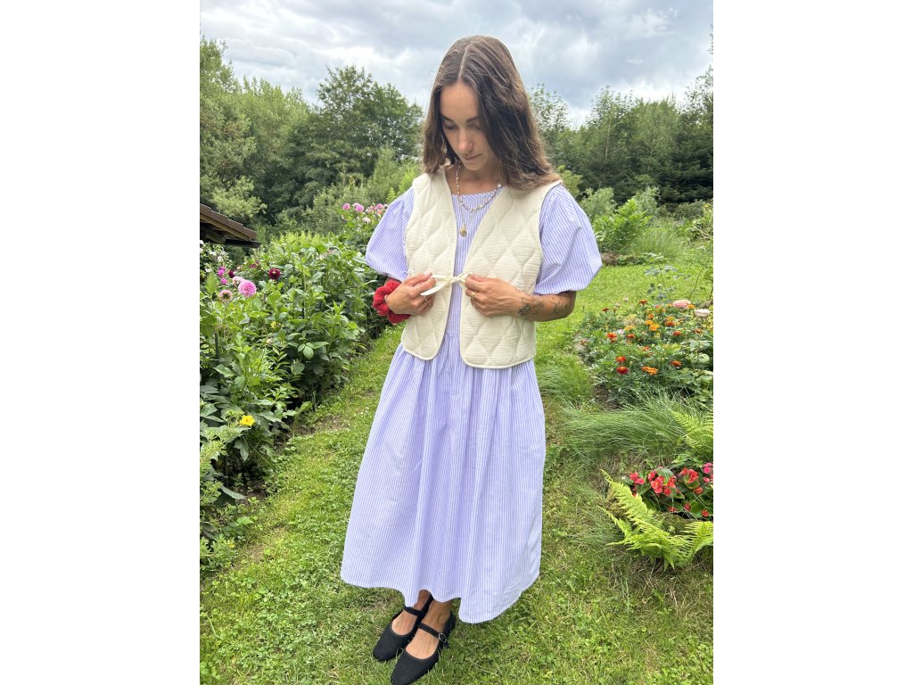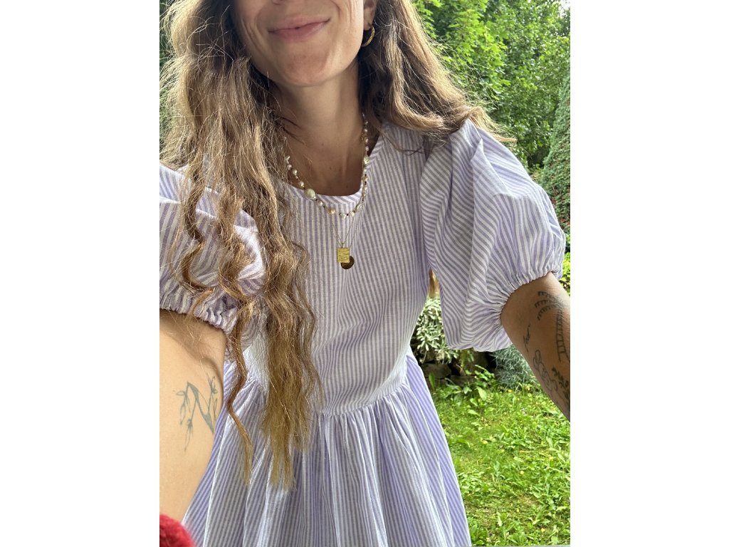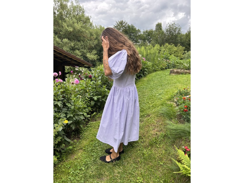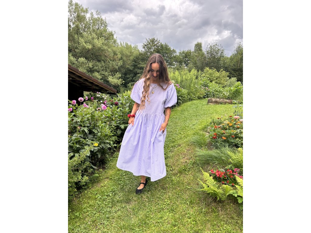 Šaty s kratšími balonovými rukávy ušité ze směsi bavlny (40%) se lnem (60%), midi/maxi délka, sukně s kapsami a klasický top.