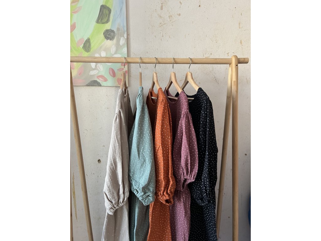 Šaty s balonovými rukávy ušité z bavlněného mušelínu.