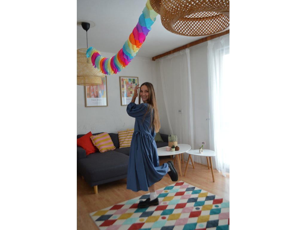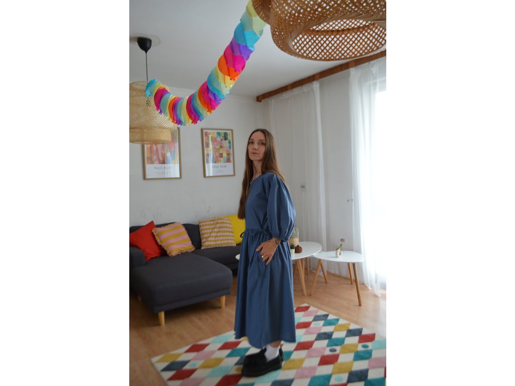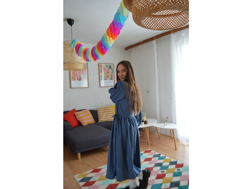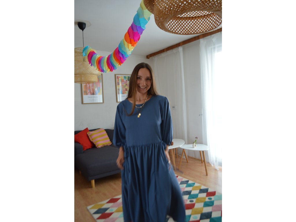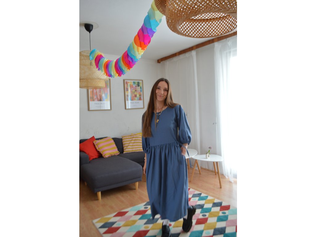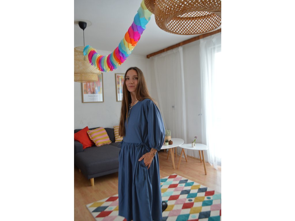 Šaty s kratšími balonovými rukávy ušité ze směsi 50% LI + 40% CO + 5% RAYON + 5% PE, midi/maxi délka, sukně s kapsami a klasický top. Šaty jsou ozvláštněné provázky v pase, které si můžete zavázat dle libosti. Zavázání krásně zvýrazní pas.