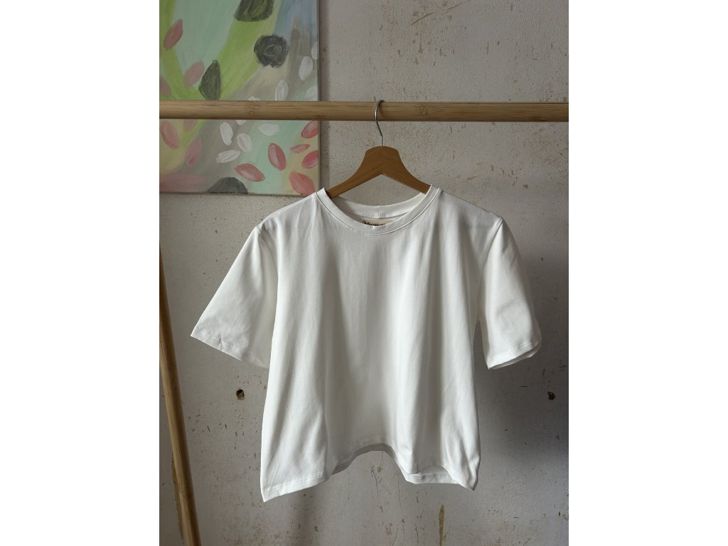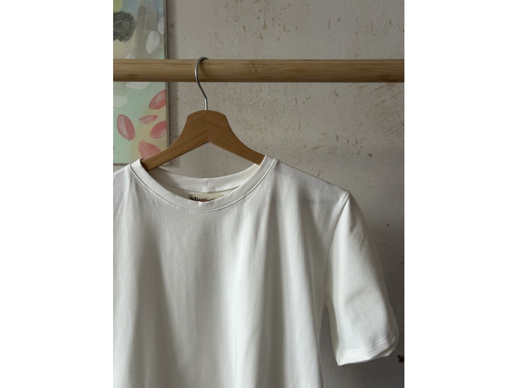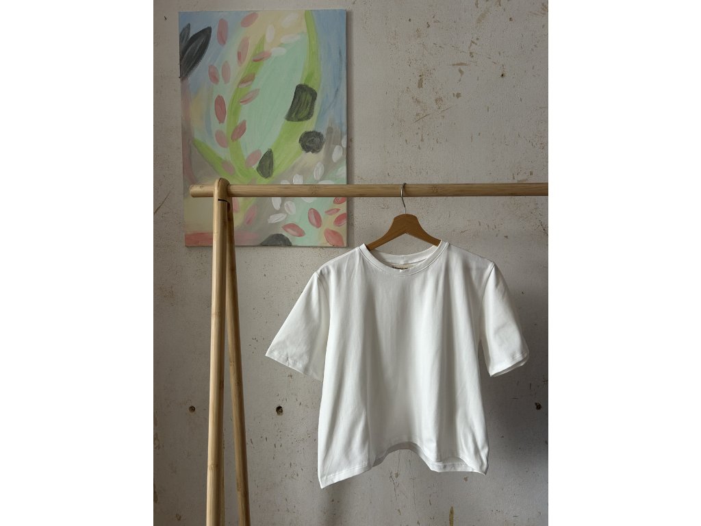 Minimalistické tričko z bavlněného úpletu na každý den. Prodloužený krátký rukáv, mírně spadlá linie ramen, zkrácený střih, aby se dalo tričko příjemně zastrčit do kalhot nebo sukně.