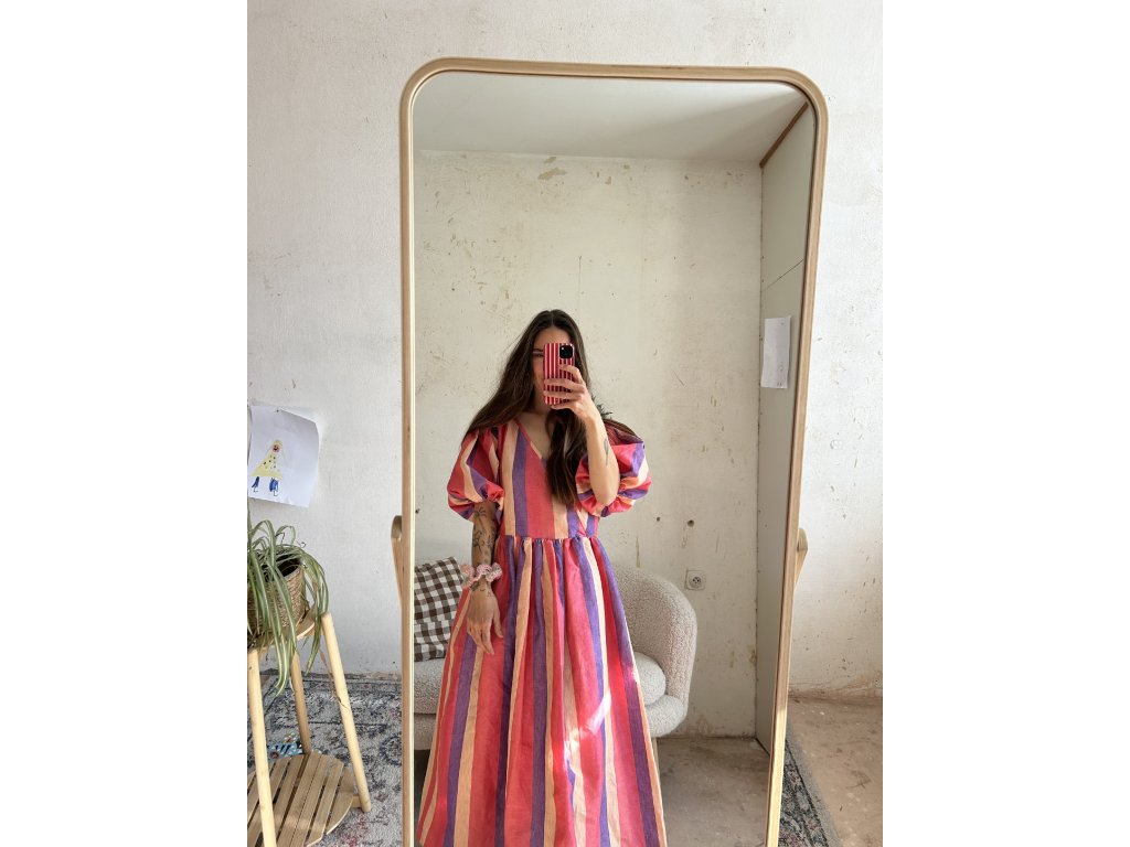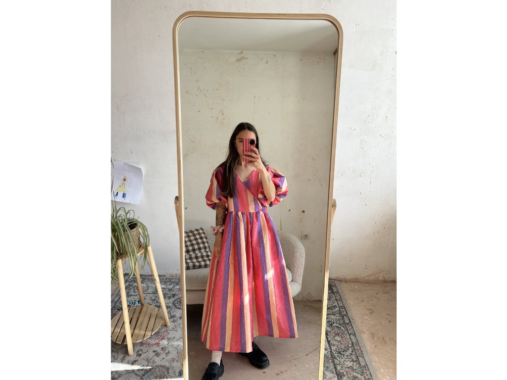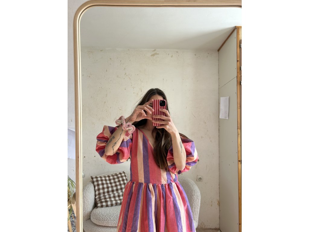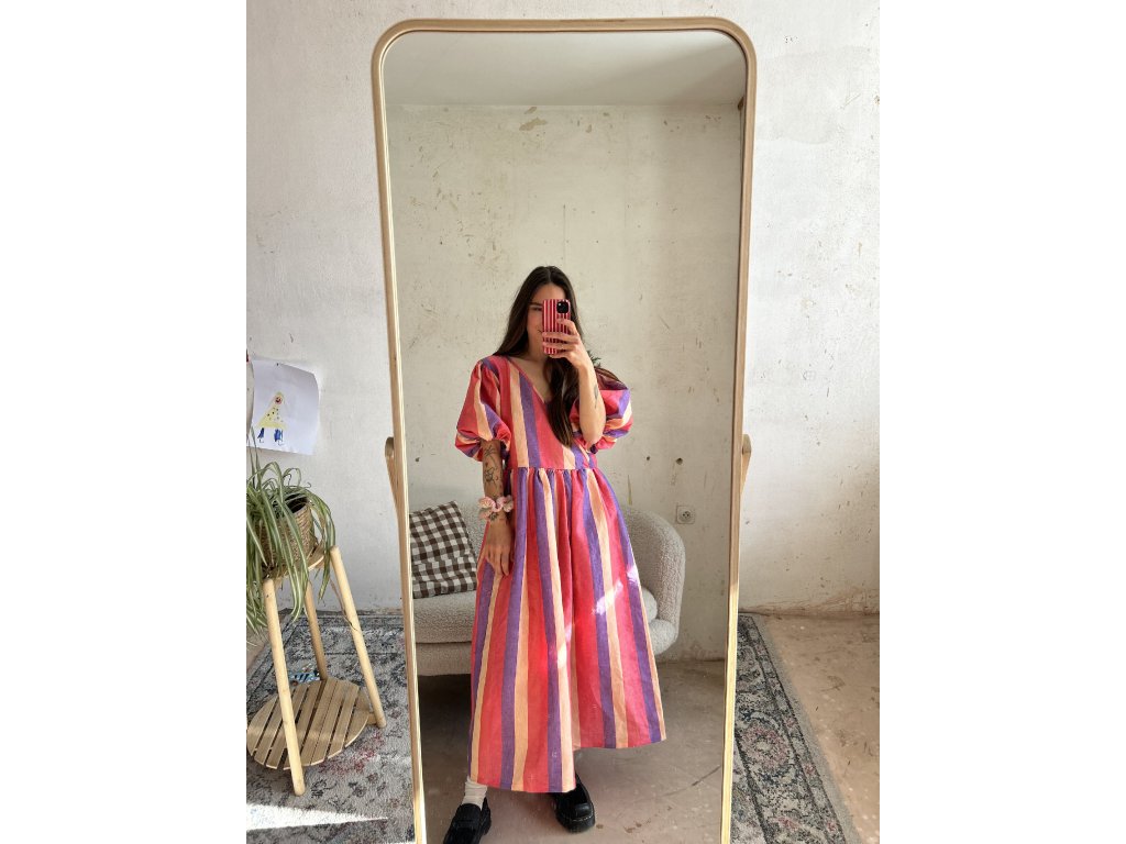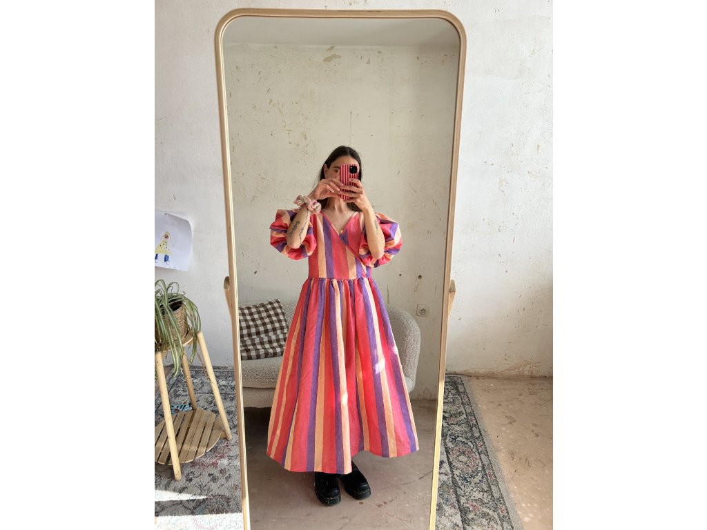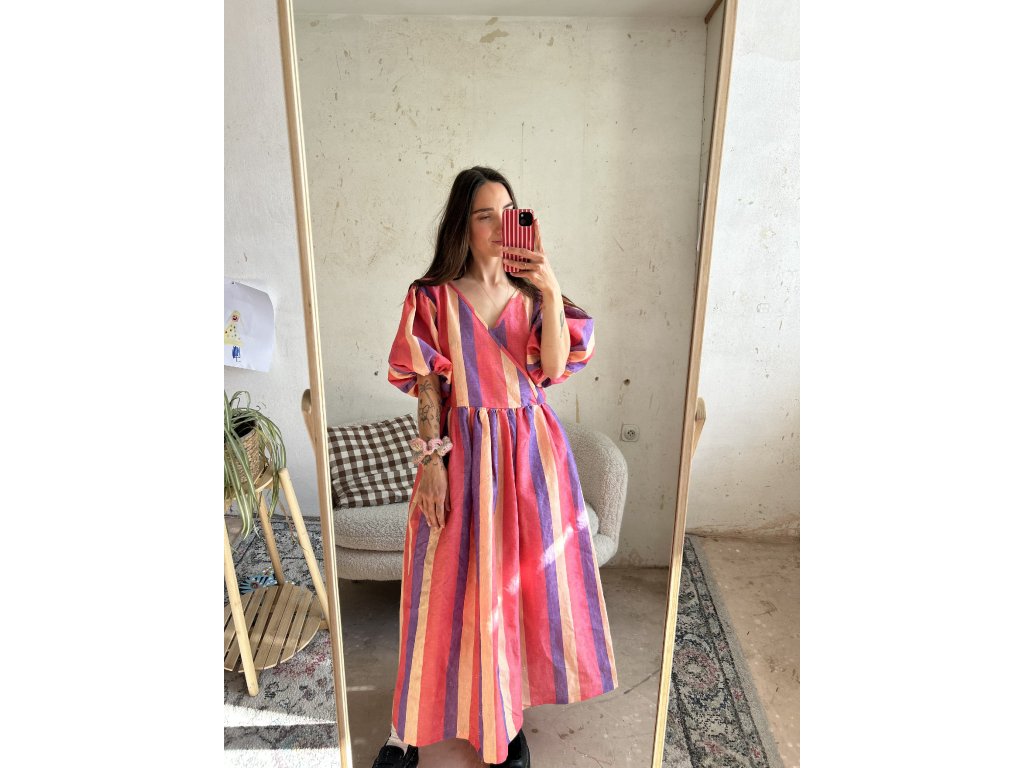 Šaty s balonovými rukávy ušité z 100% lněného kanafasu české výroby, midi délka s kapsami a překřížený top ve kterém pohodlně nakojíte.
