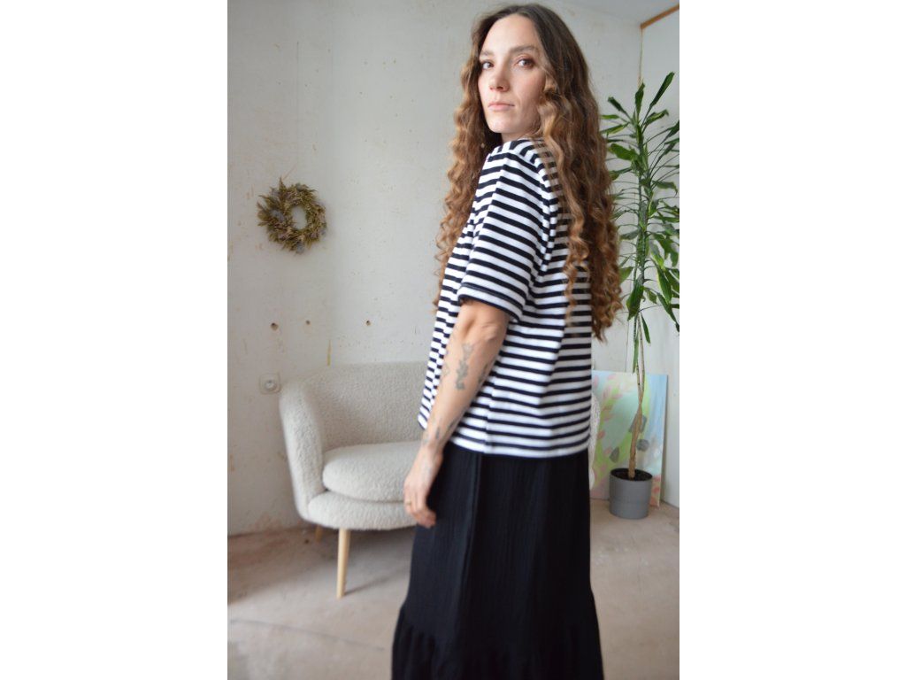 Minimalistické tričko z bavlněného úpletu na každý den. Prodloužený krátký rukáv, mírně spadlá linie ramen, zkrácený střih, aby se dalo tričko příjemně zastrčit do kalhot nebo sukně.