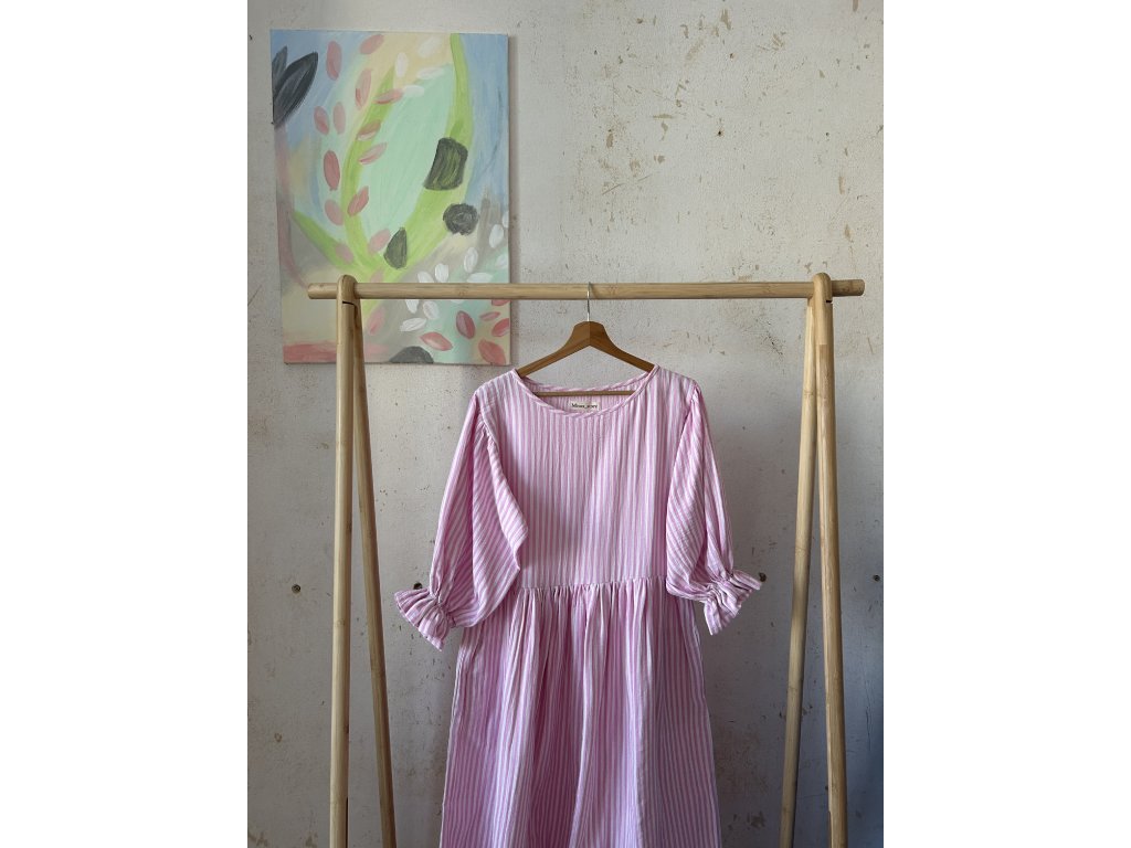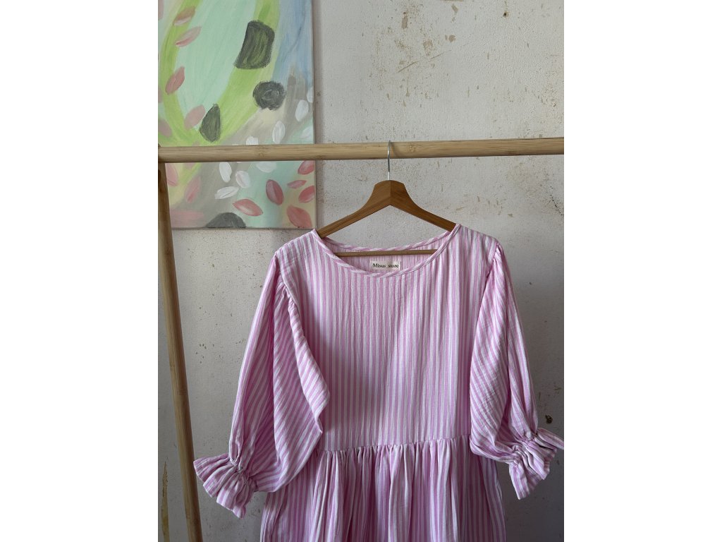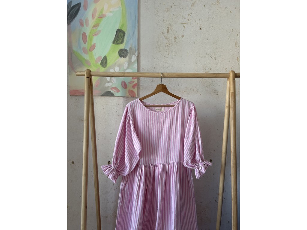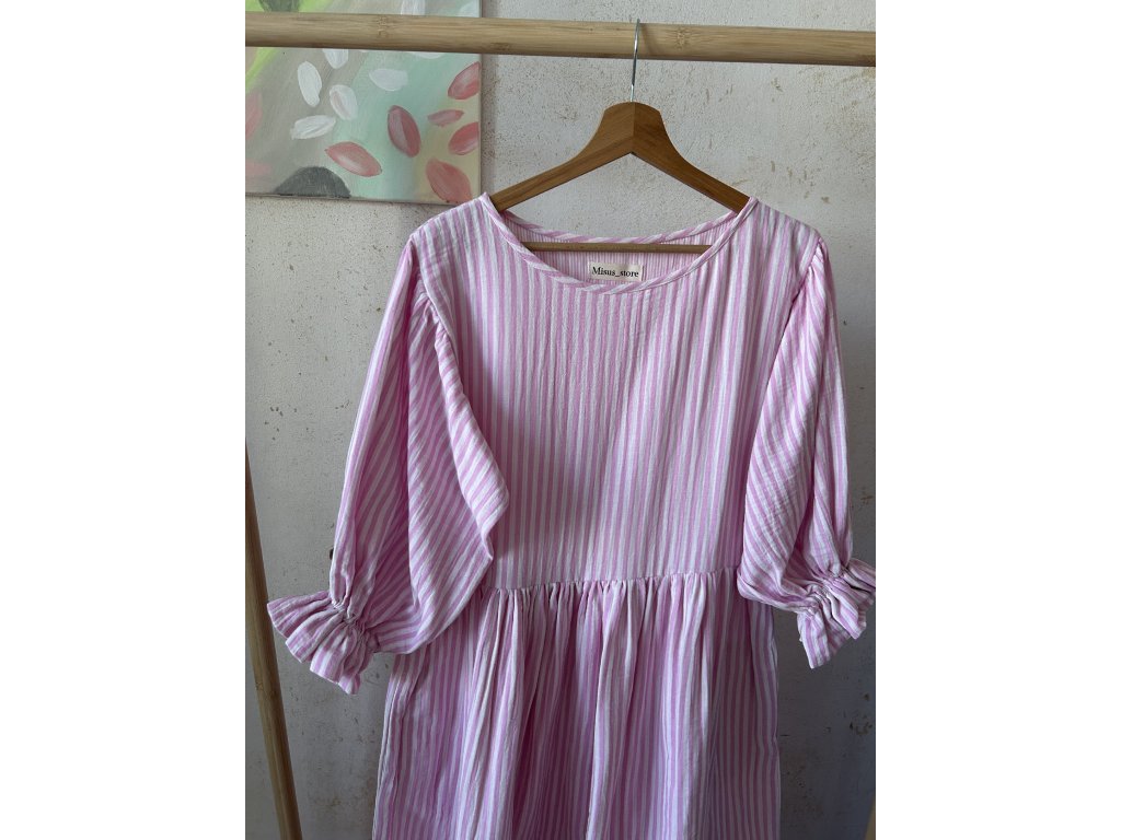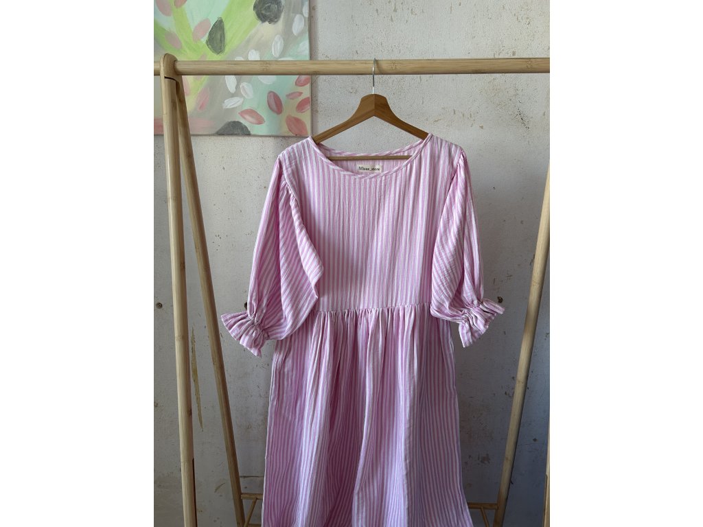 Růžové proužkové šaty s volánkovým rukávem