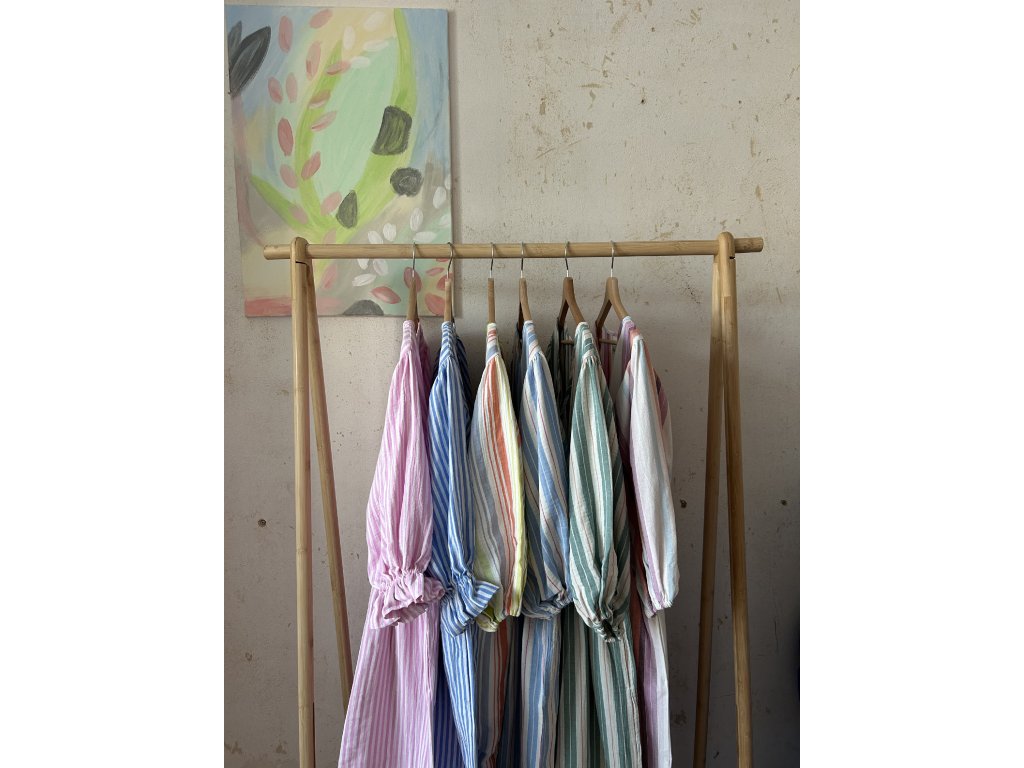 Šaty s balonovými rukávy ušité z bavlněného mušelínu. midi/maxi délka, rukáv s volánkem, sukně s kapsami a klasický top.