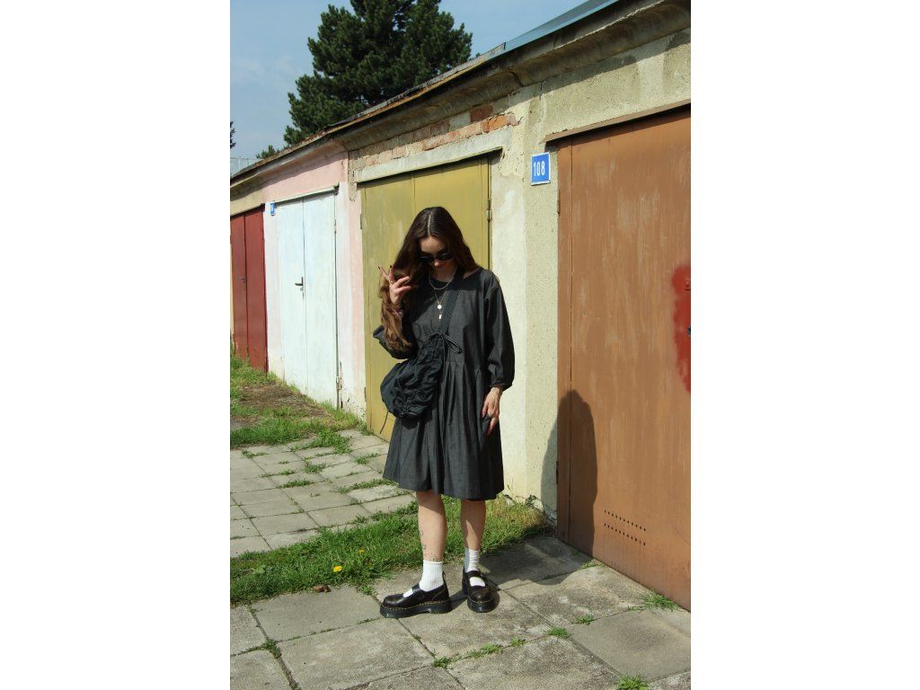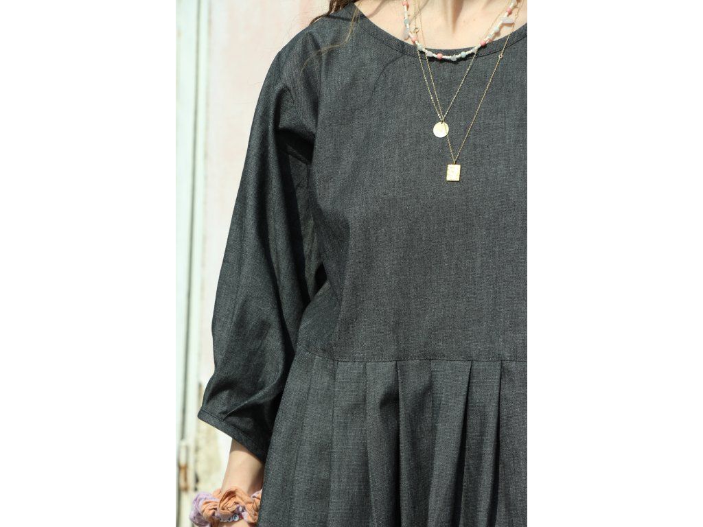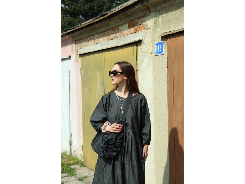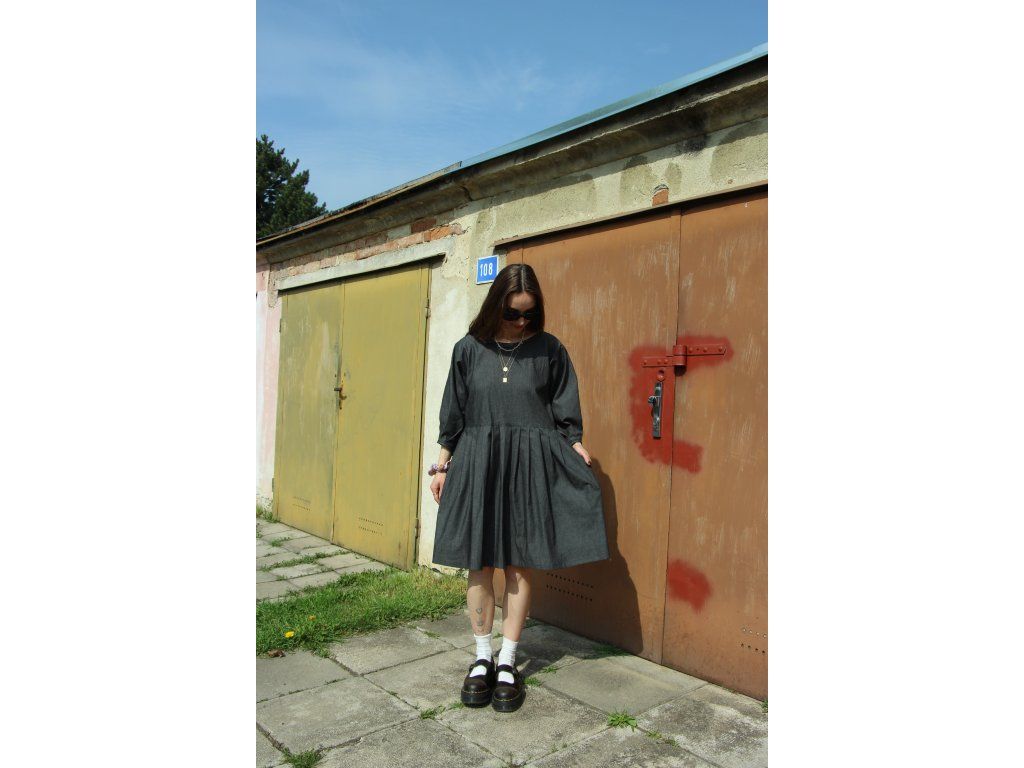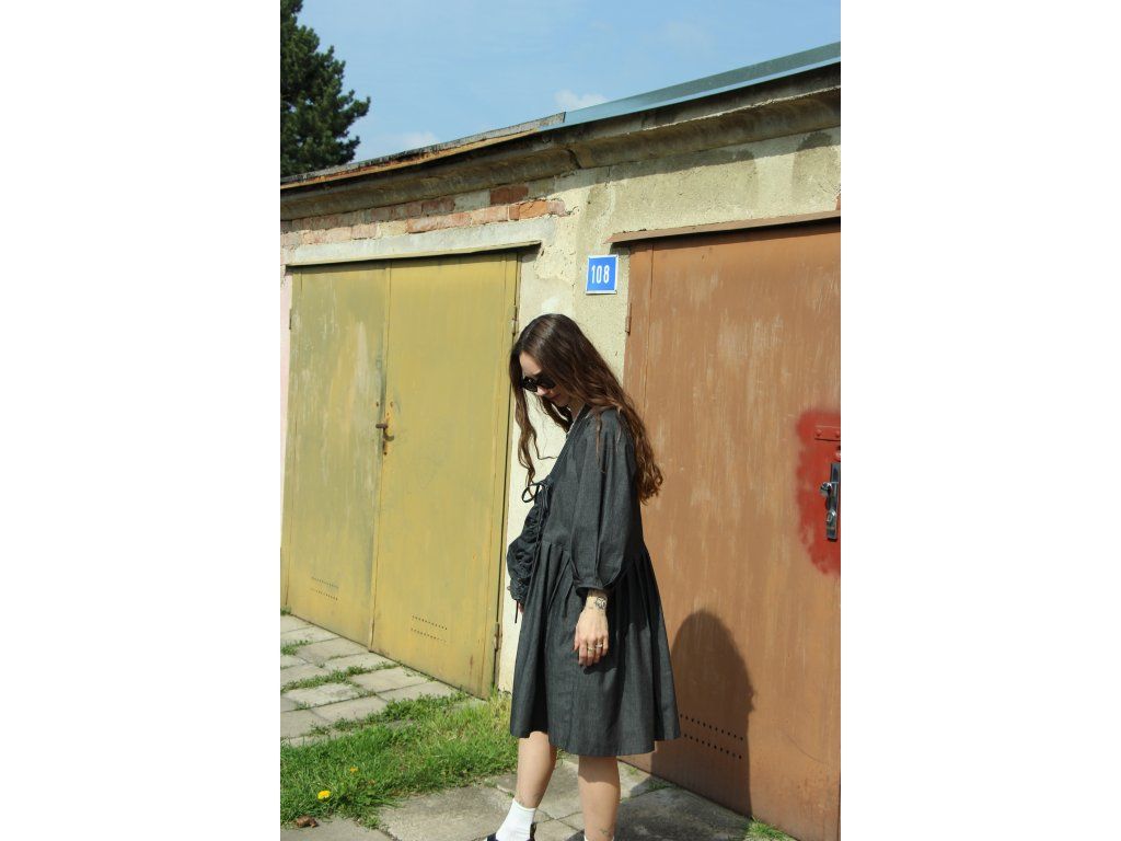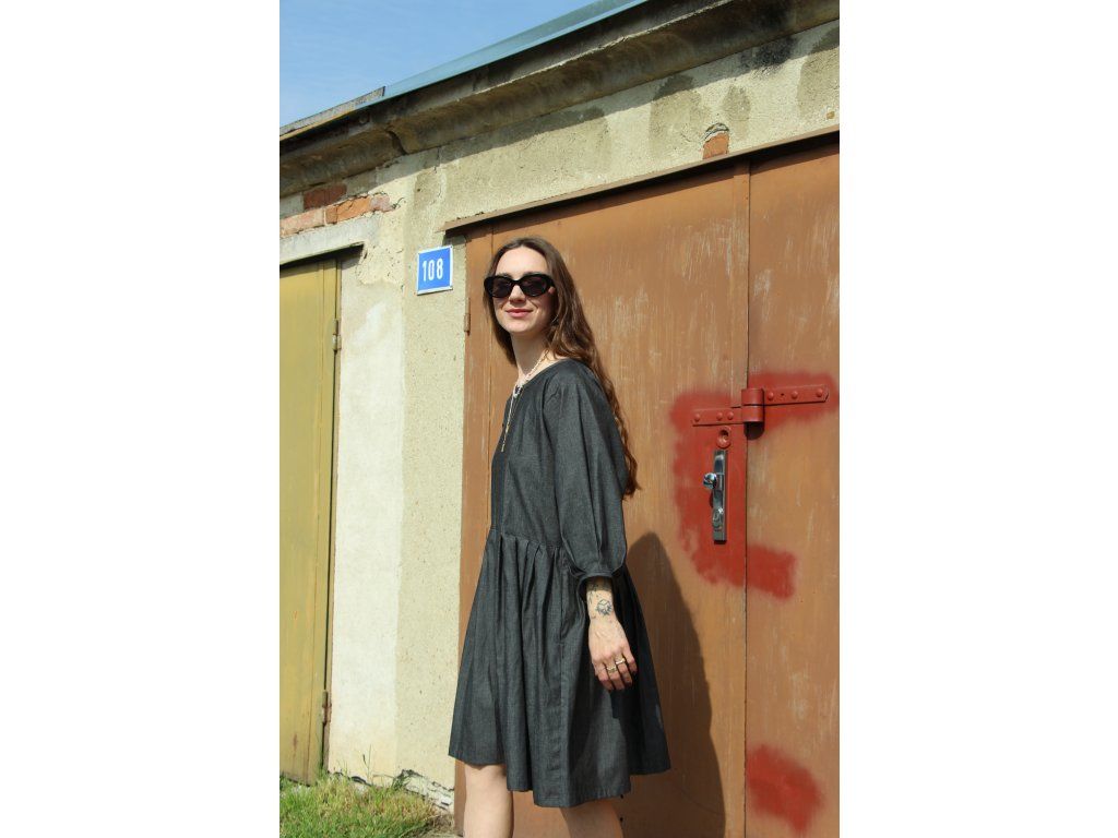 Šaty s balonovými rukávy ušité z bavlněného denimu, kratší délka a skládané rukávy a sukně.
