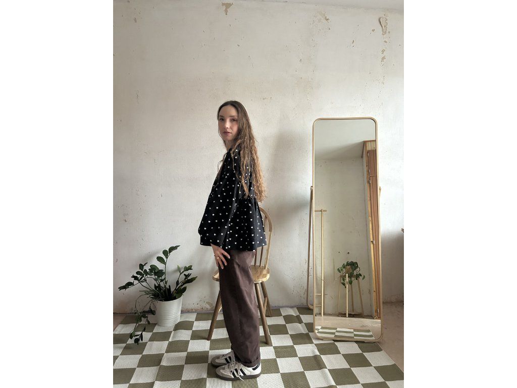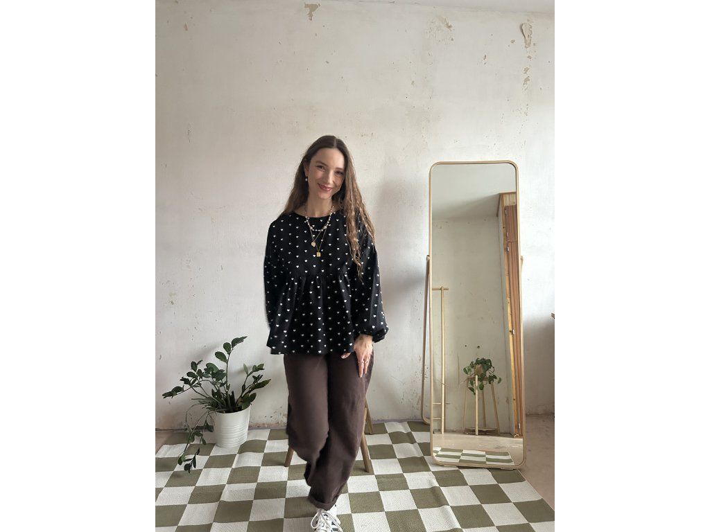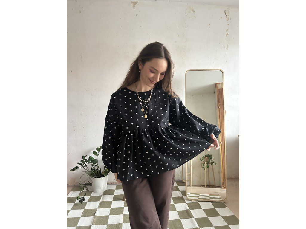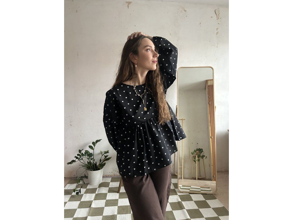 Halenka ušitá z bavlněného popelínu s volánkem a dlouhým balonovým rukávem. Volný střih pro maximální pohodlí.