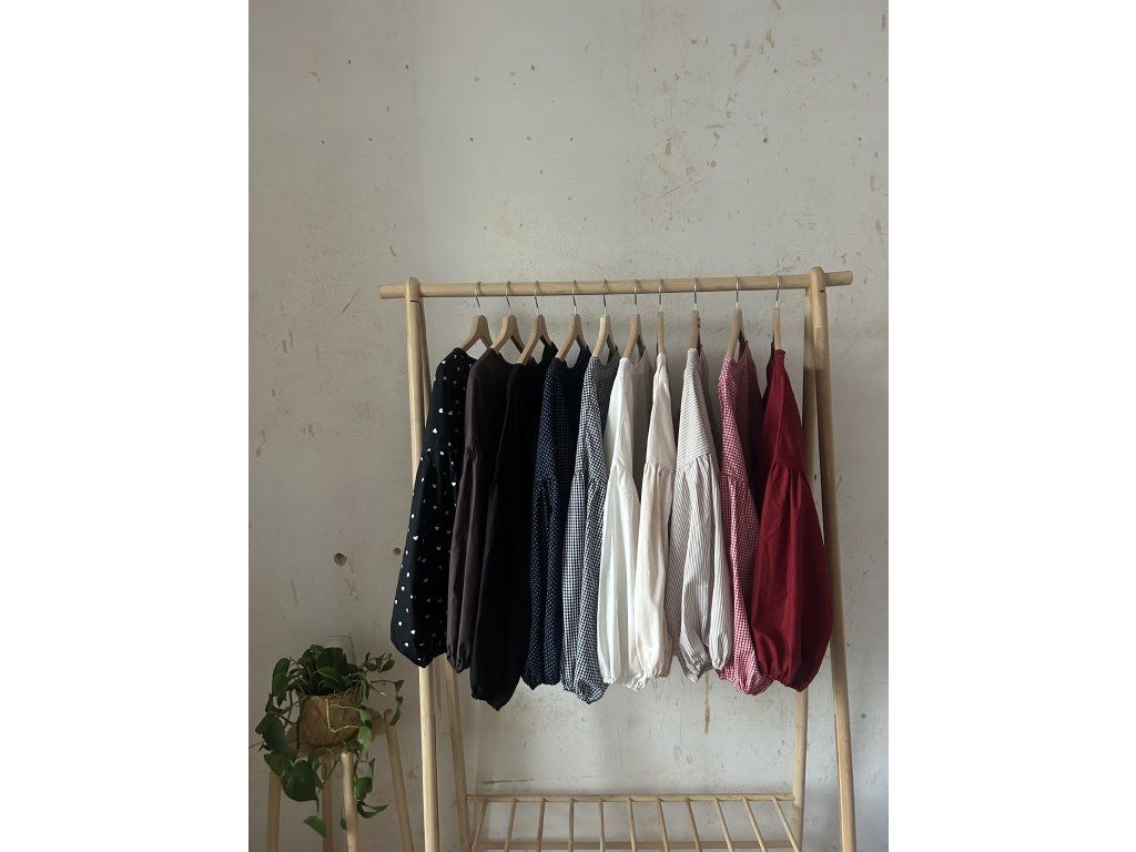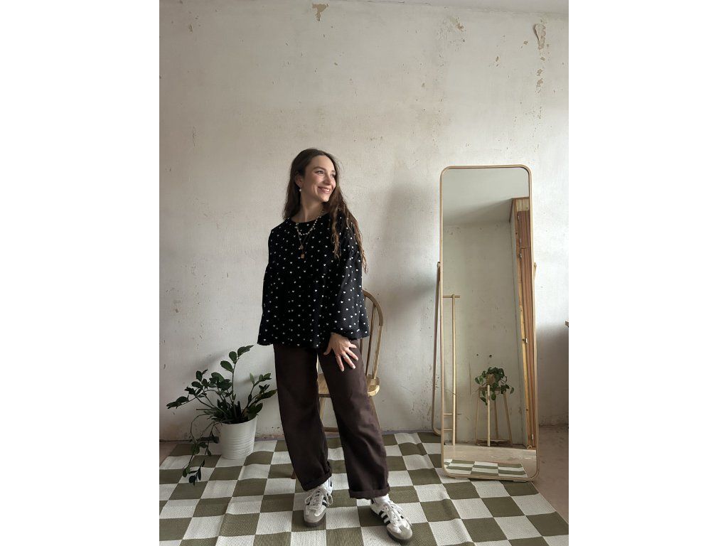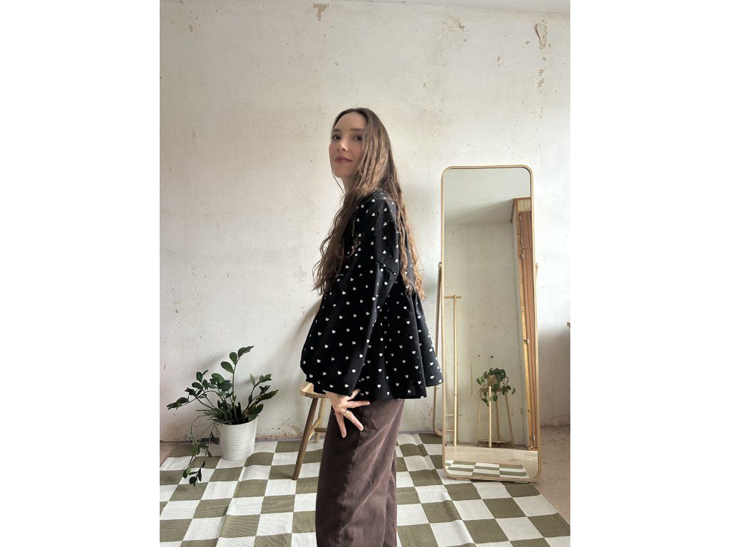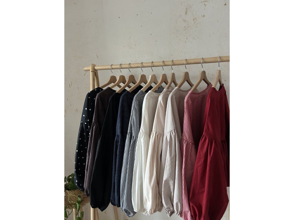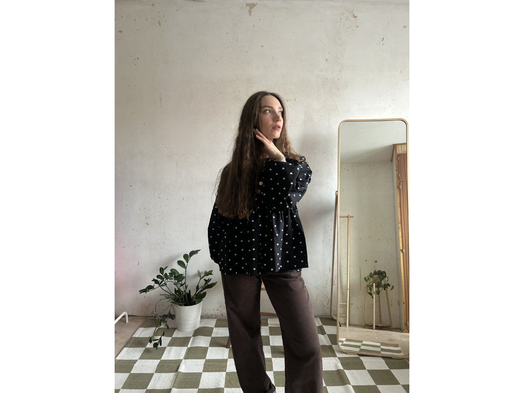 Halenka ušitá z bavlněného popelínu s volánkem a dlouhým balonovým rukávem. Volný střih pro maximální pohodlí.