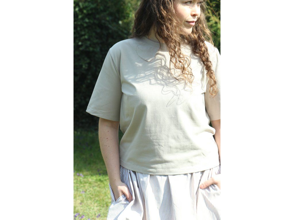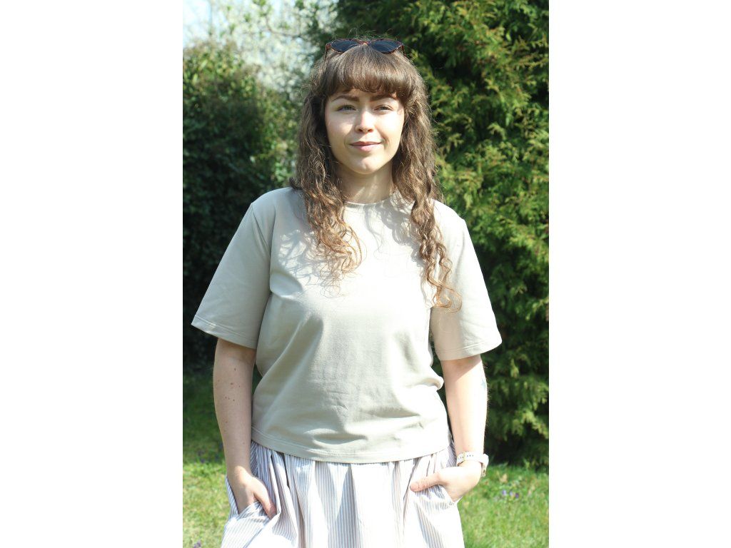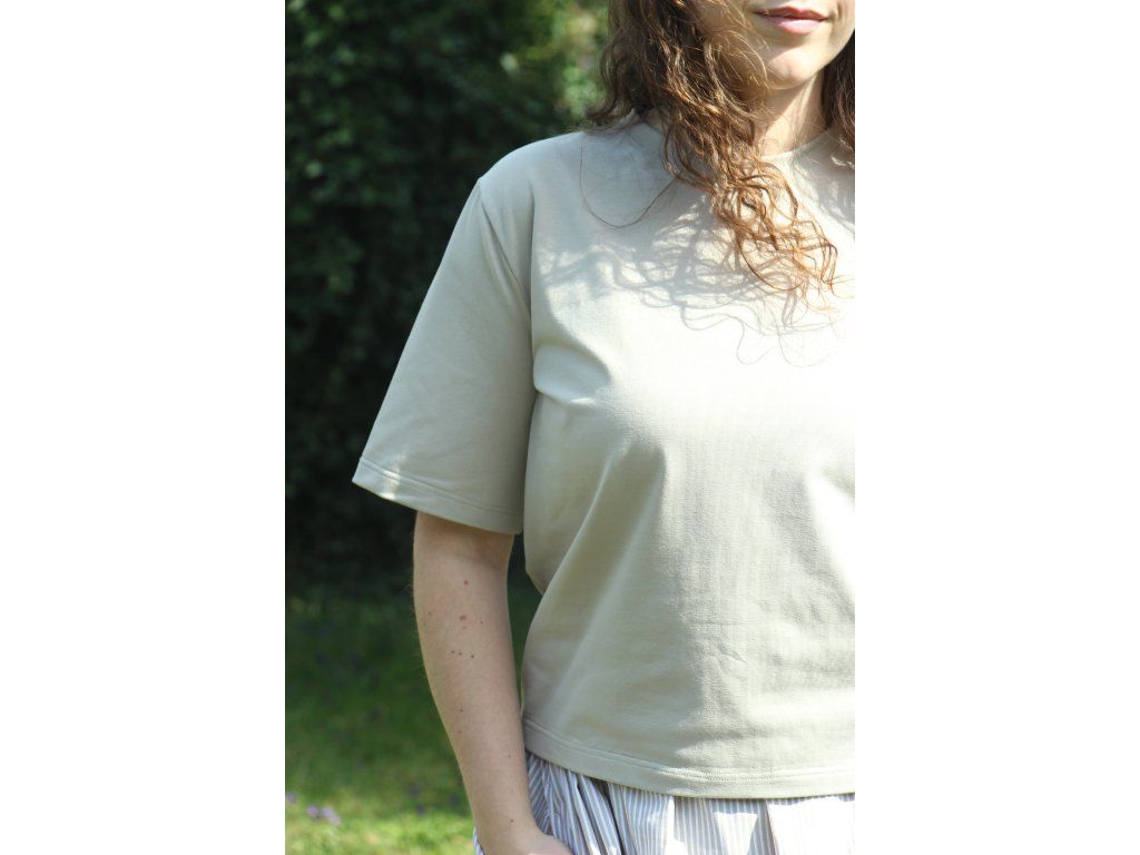 Minimalistické tričko z bavlněného úpletu na každý den. Prodloužený krátký rukáv, mírně spadlá linie ramen, zkrácený střih, aby se dalo tričko příjemně zastrčit do kalhot nebo sukně.