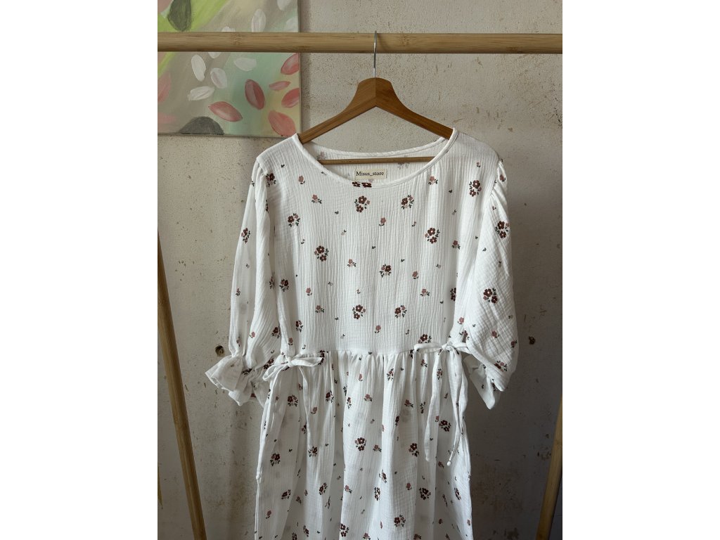 Šaty s balonovými rukávy ušité z bavlněného mušelínu. midi/maxi délka, sukně s kapsami a klasický top. Rukávy s volánkem. Mašličky v pase na zavázání.