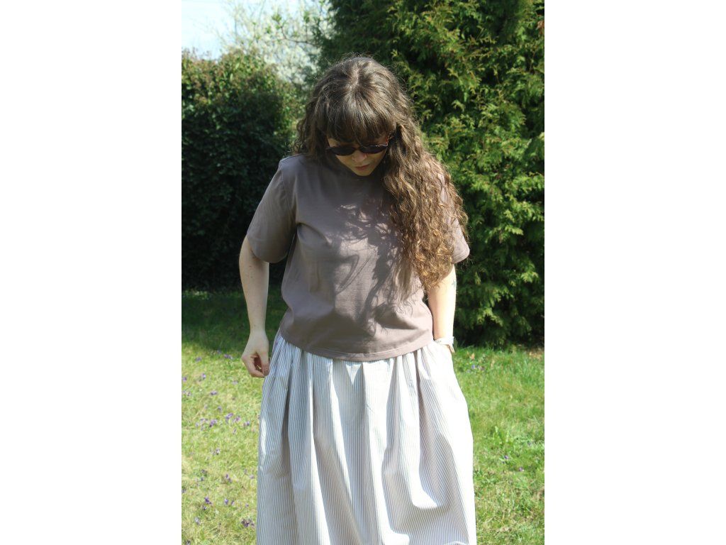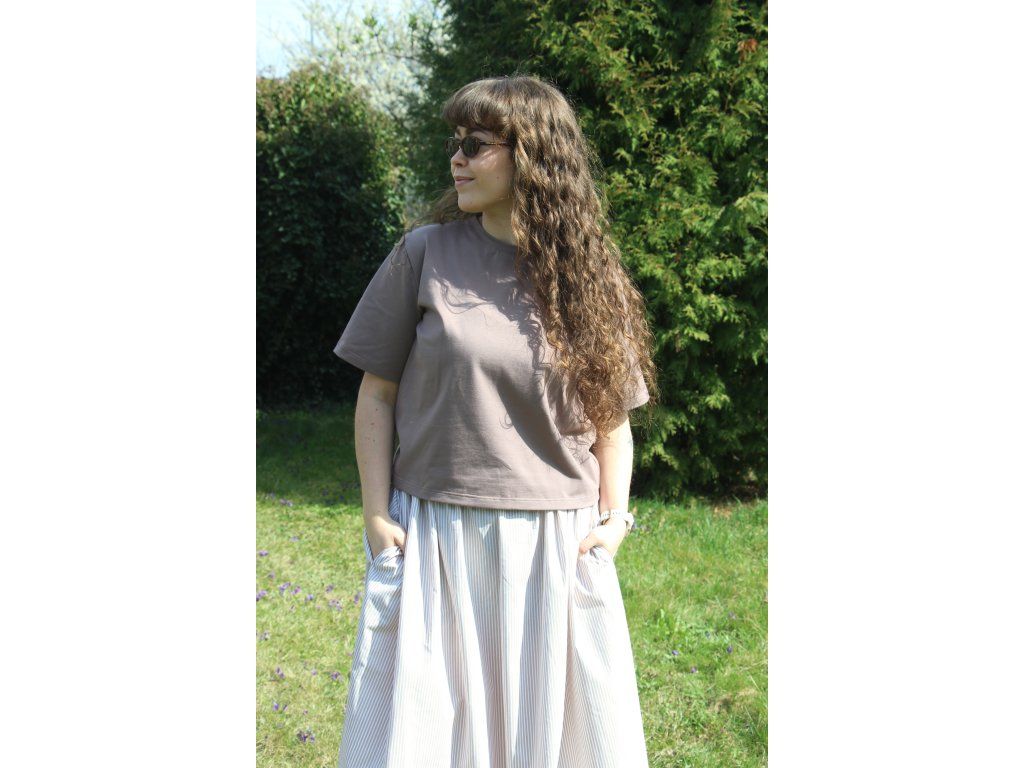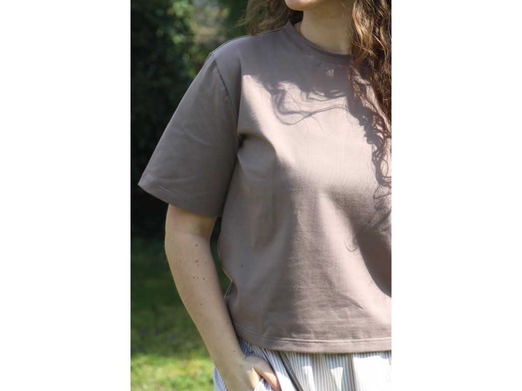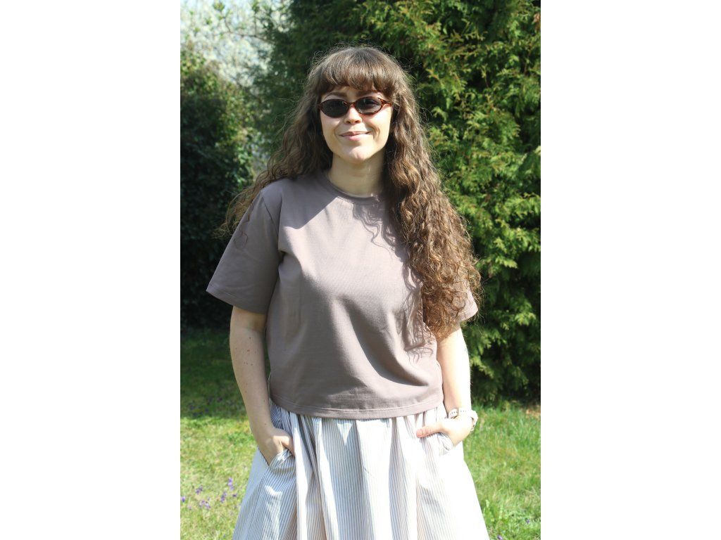 Minimalistické tričko z bavlněného úpletu na každý den. Prodloužený krátký rukáv, mírně spadlá linie ramen, zkrácený střih, aby se dalo tričko příjemně zastrčit do kalhot nebo sukně.