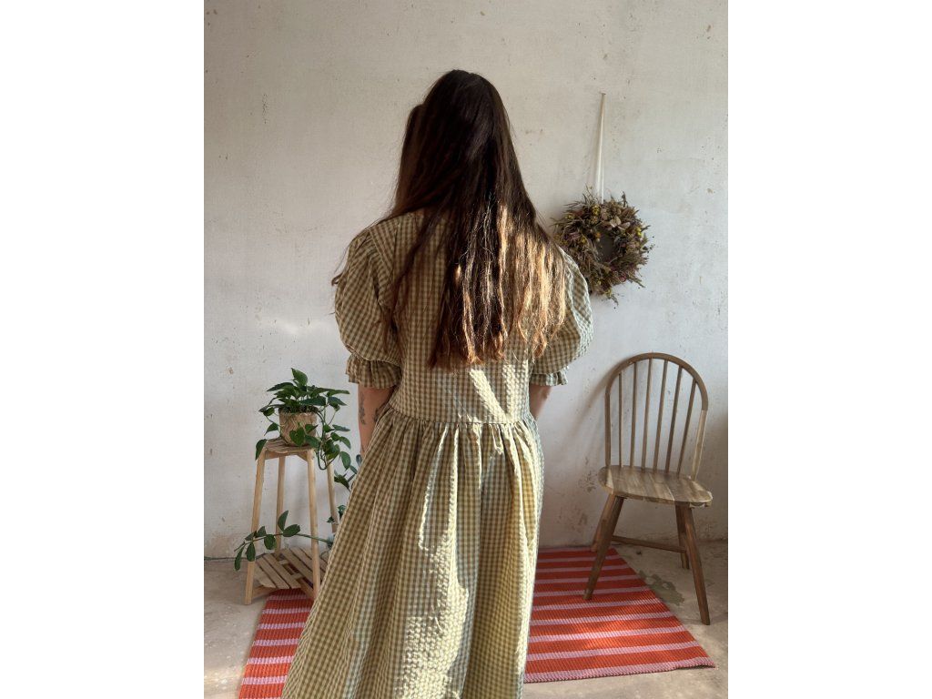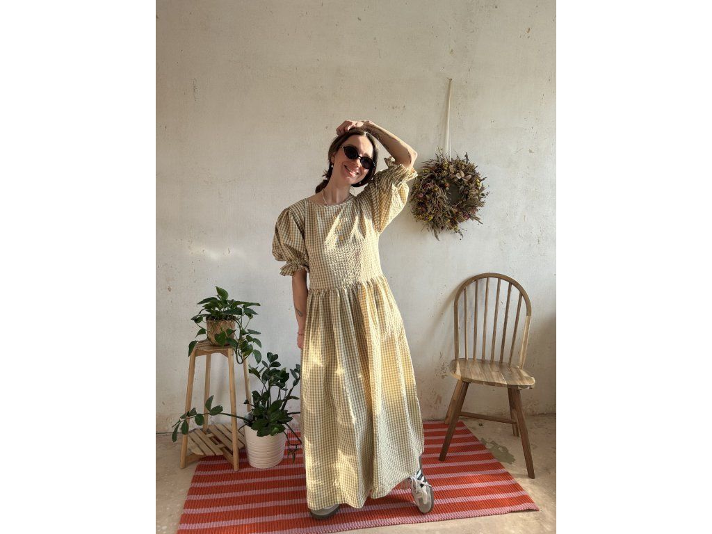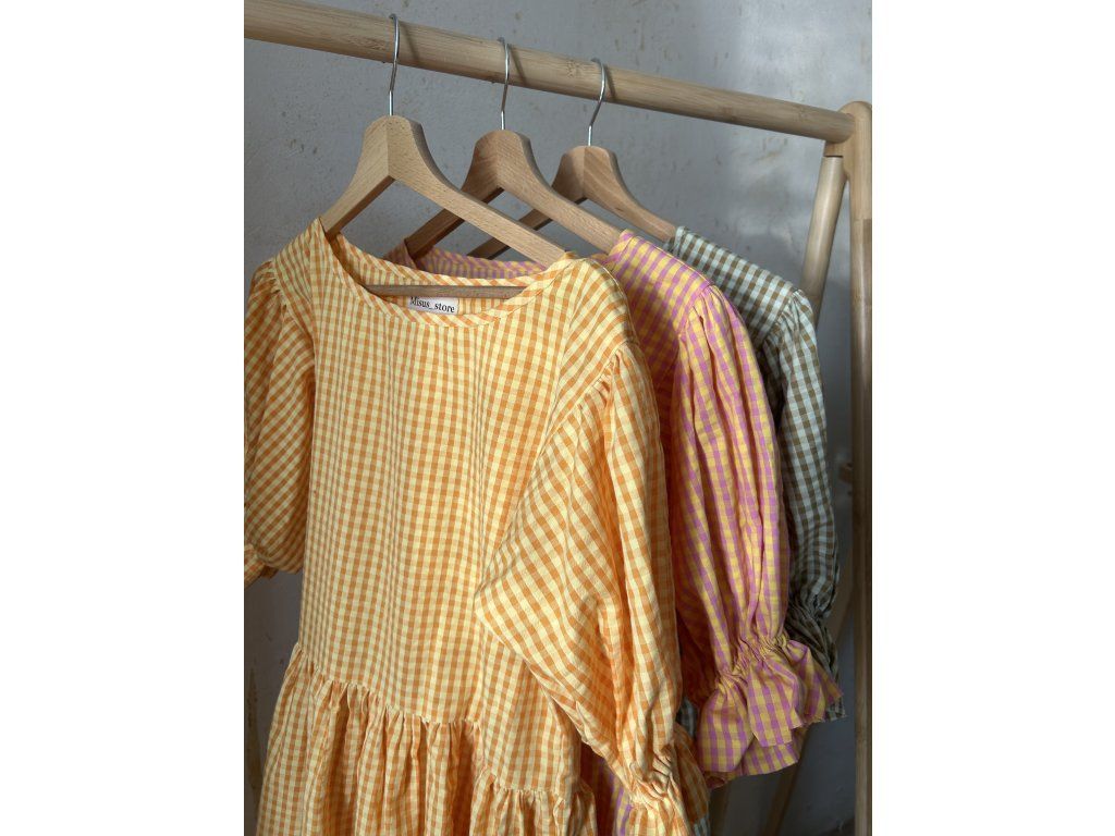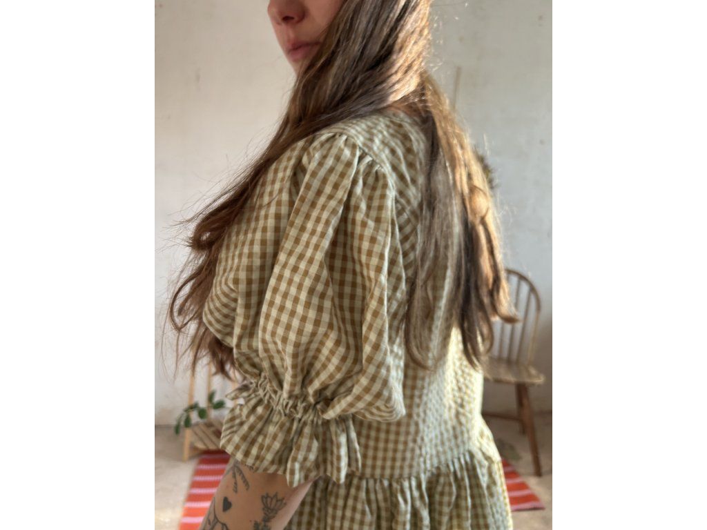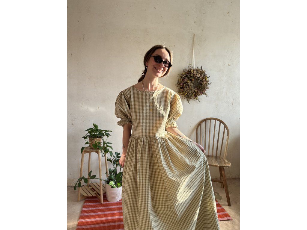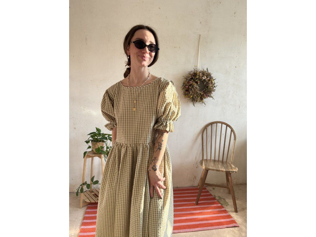 Šaty s balonovými rukávy ušité z bavlněného krepu. midi/maxi délka, sukně s kapsami a klasický top. Rukávy s volánkem v kratší délce.