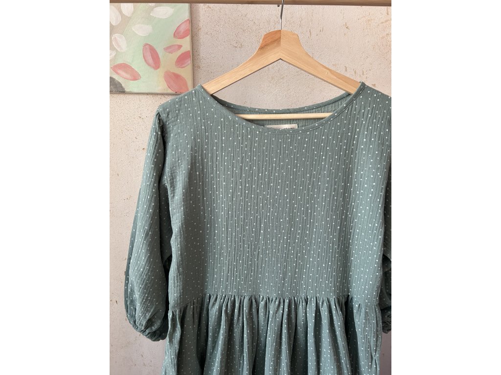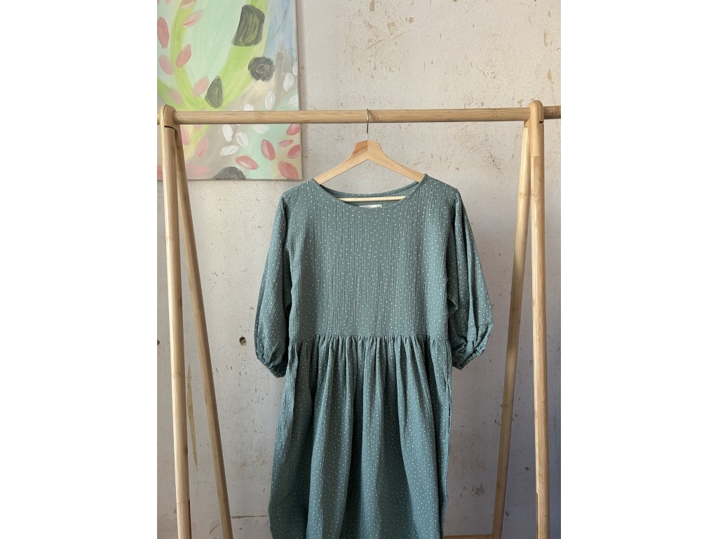 Šaty s balonovými rukávy ušité z bavlněného mušelínu. midi/maxi délka, sukně s kapsami a klasický top.