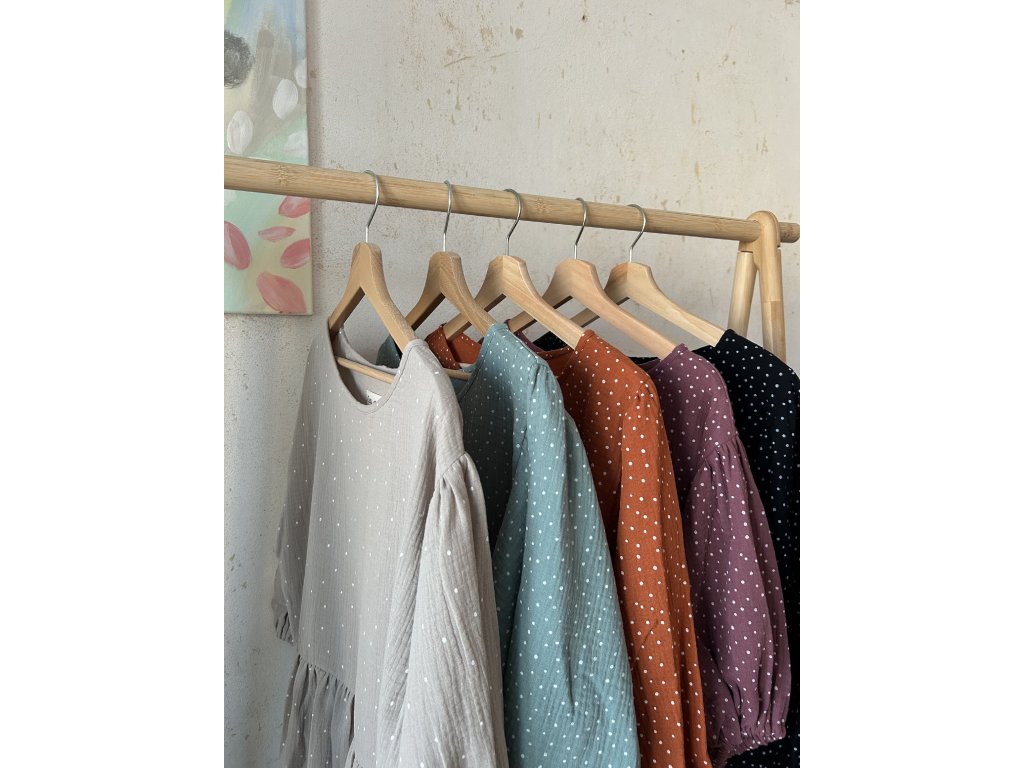 Šaty s balonovými rukávy ušité z bavlněného mušelínu.